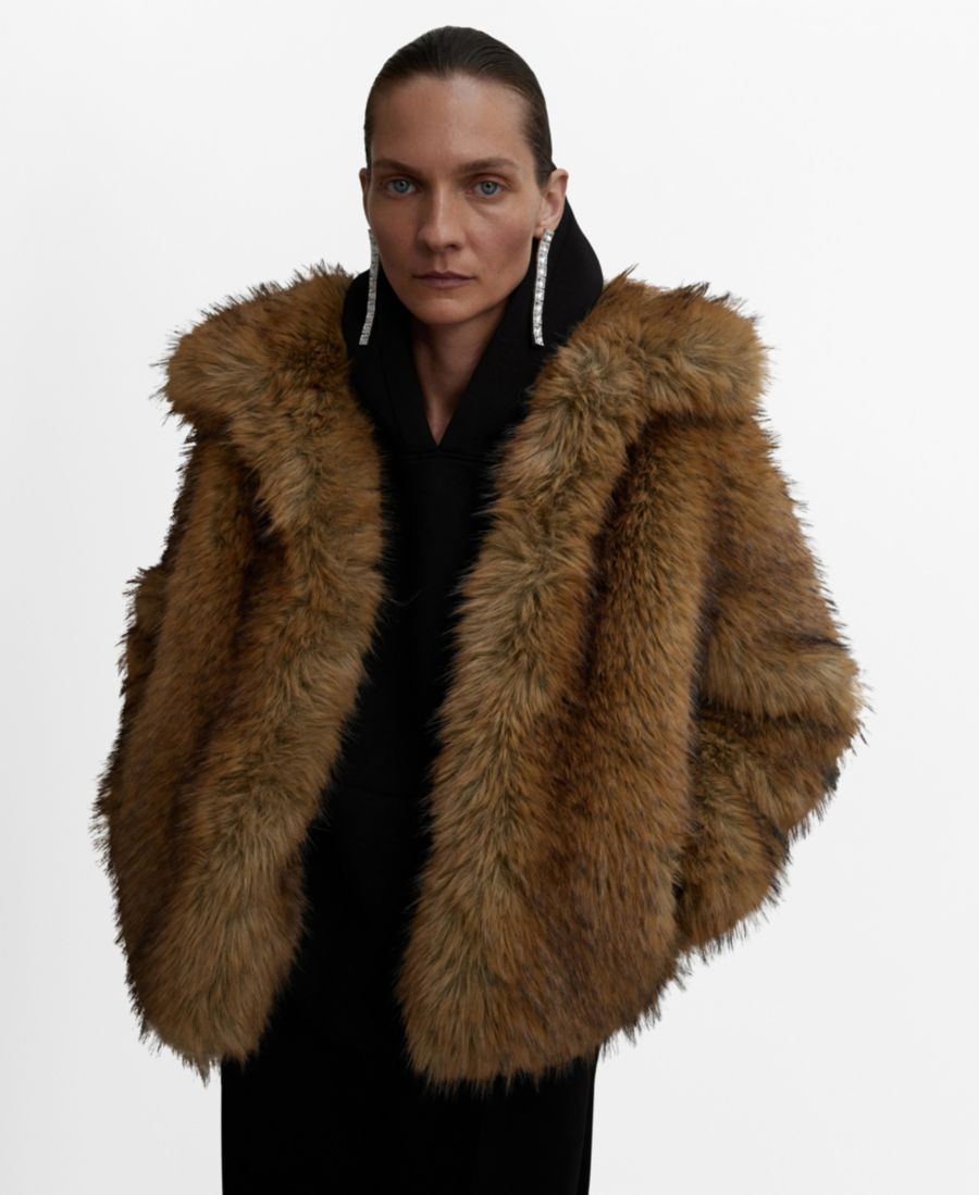 Женская куртка с лацканами и эффектом меха MANGO, Brown