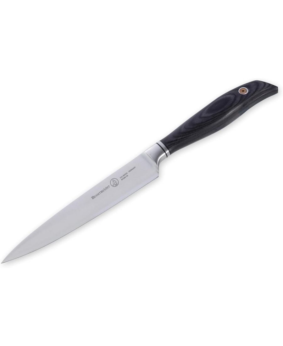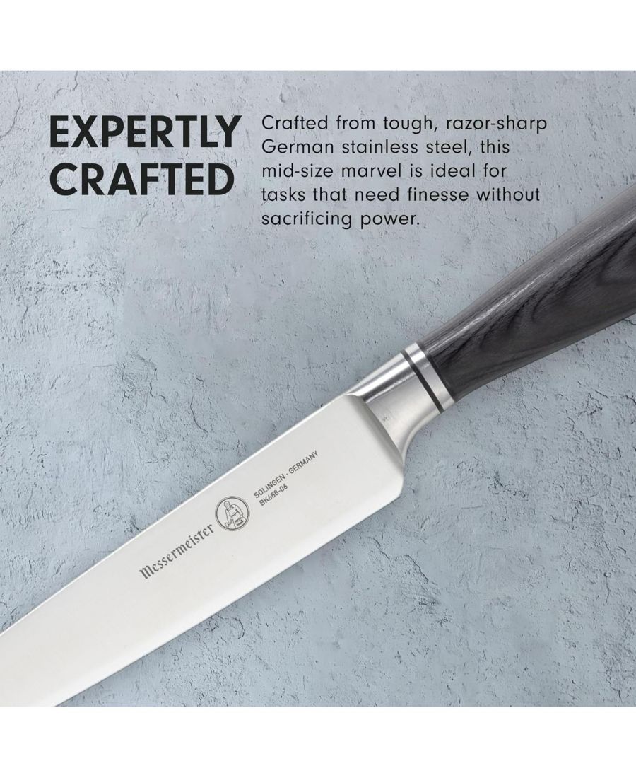Представляем вам незаметного героя вашей кухни: универсальный нож Messermeister Blacksmith Utility Knife длиной 6 дюймов. Изготовленный из прочной, невероятно острой немецкой нержавеющей стали, этот нож среднего размера идеально подходит для задач, требующих точности без ущерба для мощности. Будь то нарезка свежих помидоров, разделка мясных нарезок для бутербродов или подготовка мелких фруктов и овощей, универсальный нож обеспечивает исключительный баланс, стойкость лезвия и контроль. Легкий, маневренный и с эргономичной рукояткой для комфортного использования в течение всего дня, это незаменимый нож, когда поварской нож кажется слишком большим, а нож для чистки овощей - слишком маленьким. Эта универсальная вещь необходима на каждой кухне.