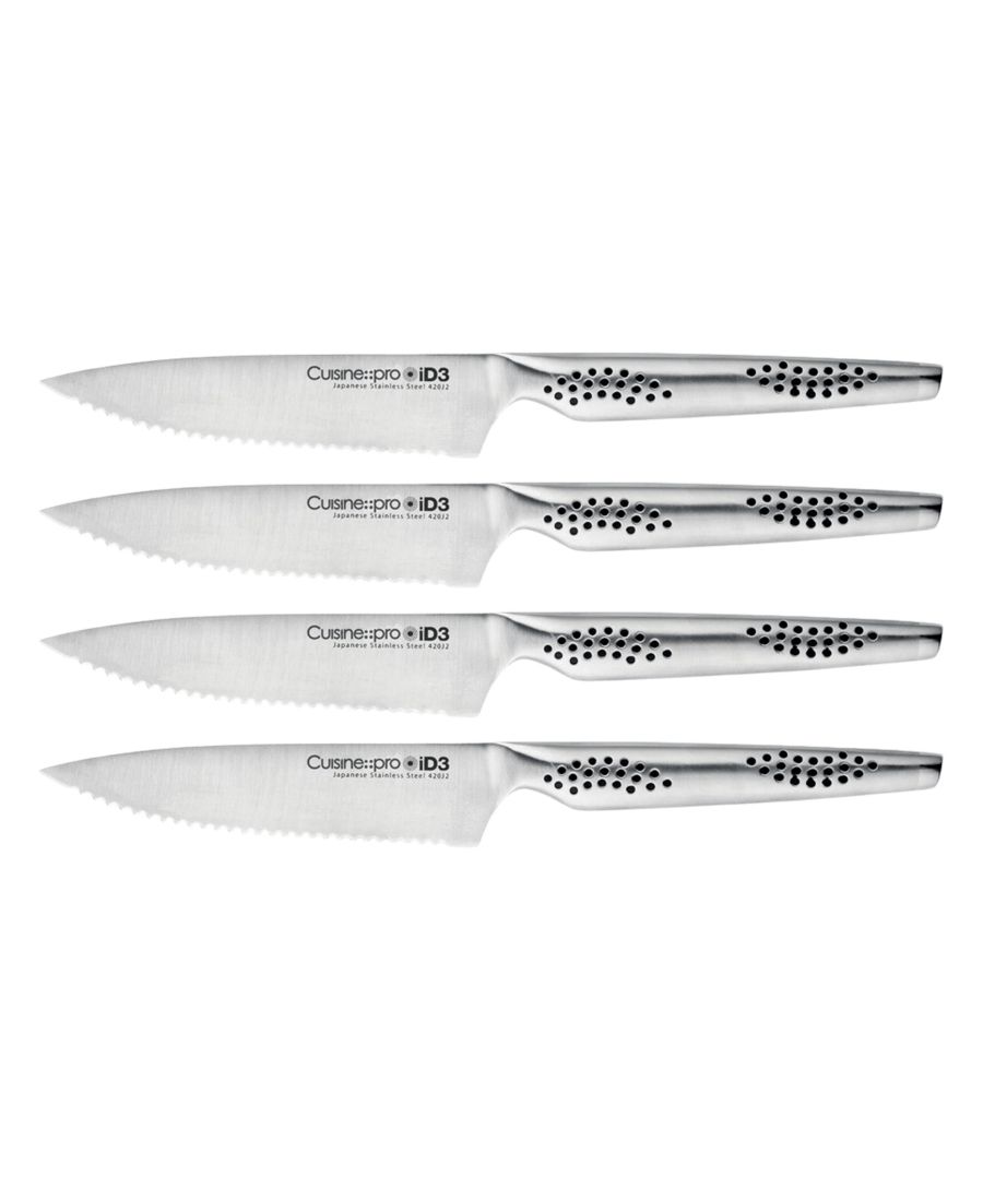 Набор Cuisine::pro® iD3 из 4 предметов В набор ножей входят элегантные ножи для стейка с идеально сбалансированными 4,5-дюймовыми зубчатыми лезвиями, изготовленными из высококачественной японской стали.