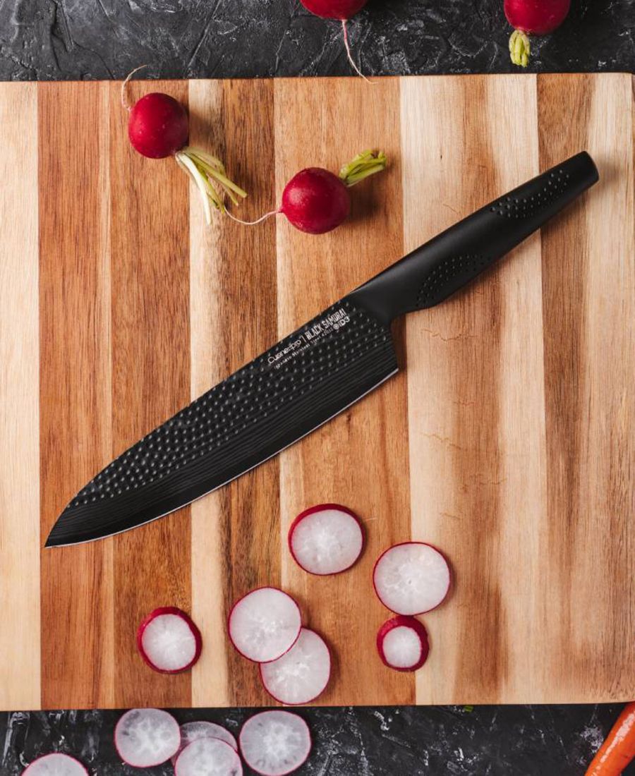 Поварской нож Cuisine::pro iD3 Black Samurai (20 см или 8 дюймов) традиционно известен как нож для приготовления пищи. Это универсальный нож, изогнутая форма которого позволяет повару покачивать нож на разделочной доске для более точной нарезки.