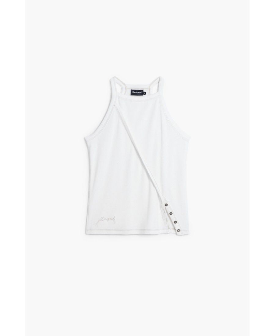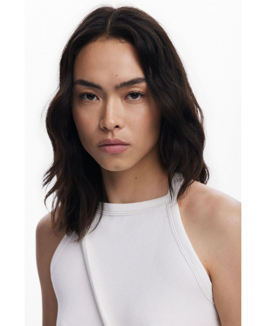 Однотонная футболка без рукавов с отделкой, диагональными деталями и разрезом по низу.