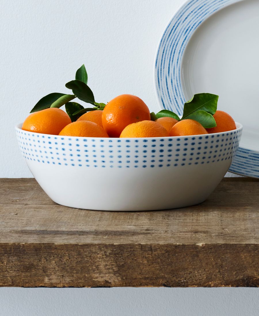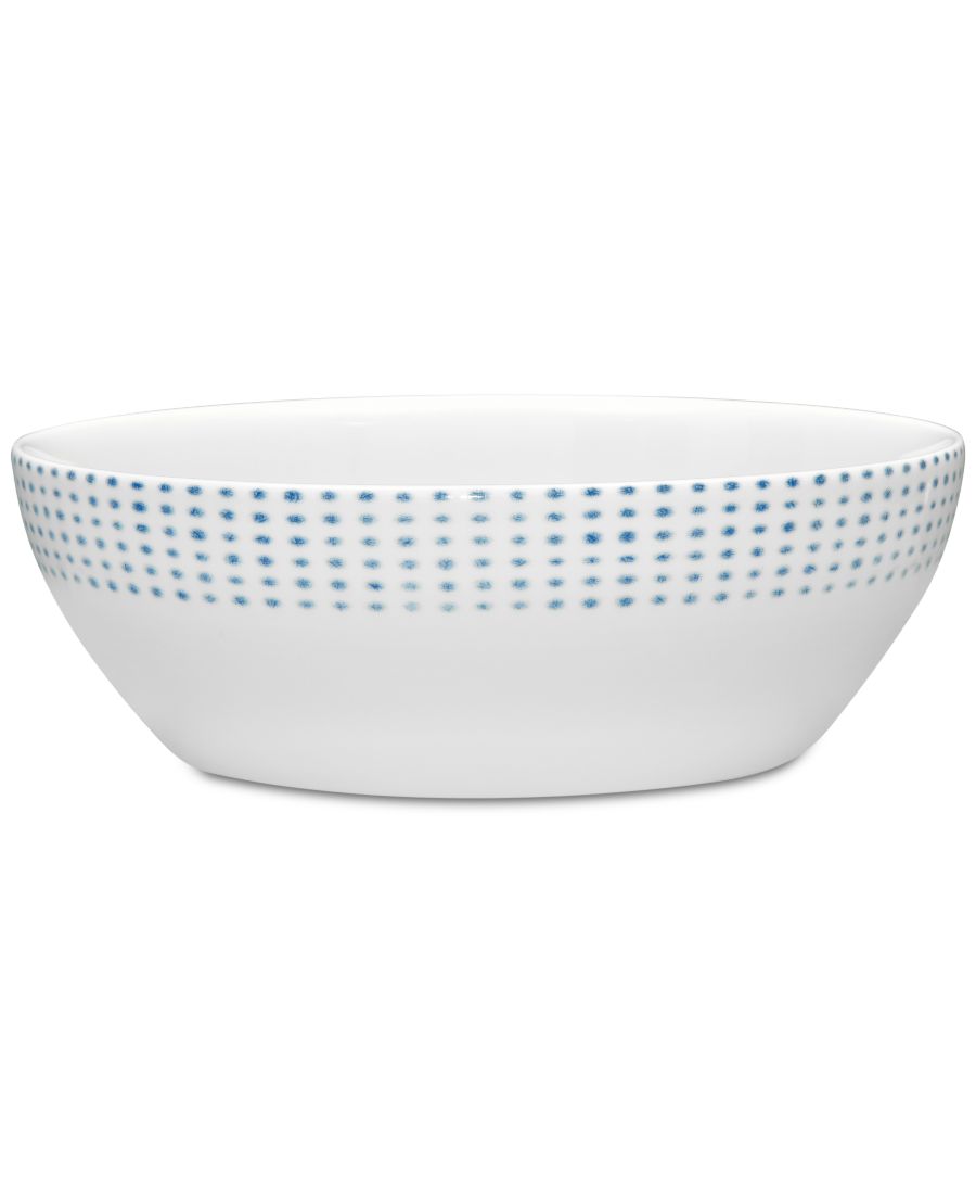 Край этой универсальной круглой овощной миски из коллекции посуды Blue Hammock от Noritake украшен узором из бледно-голубых точек.