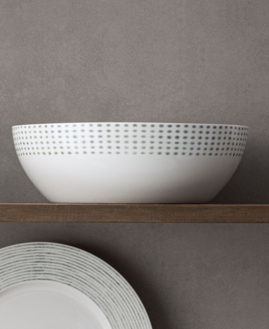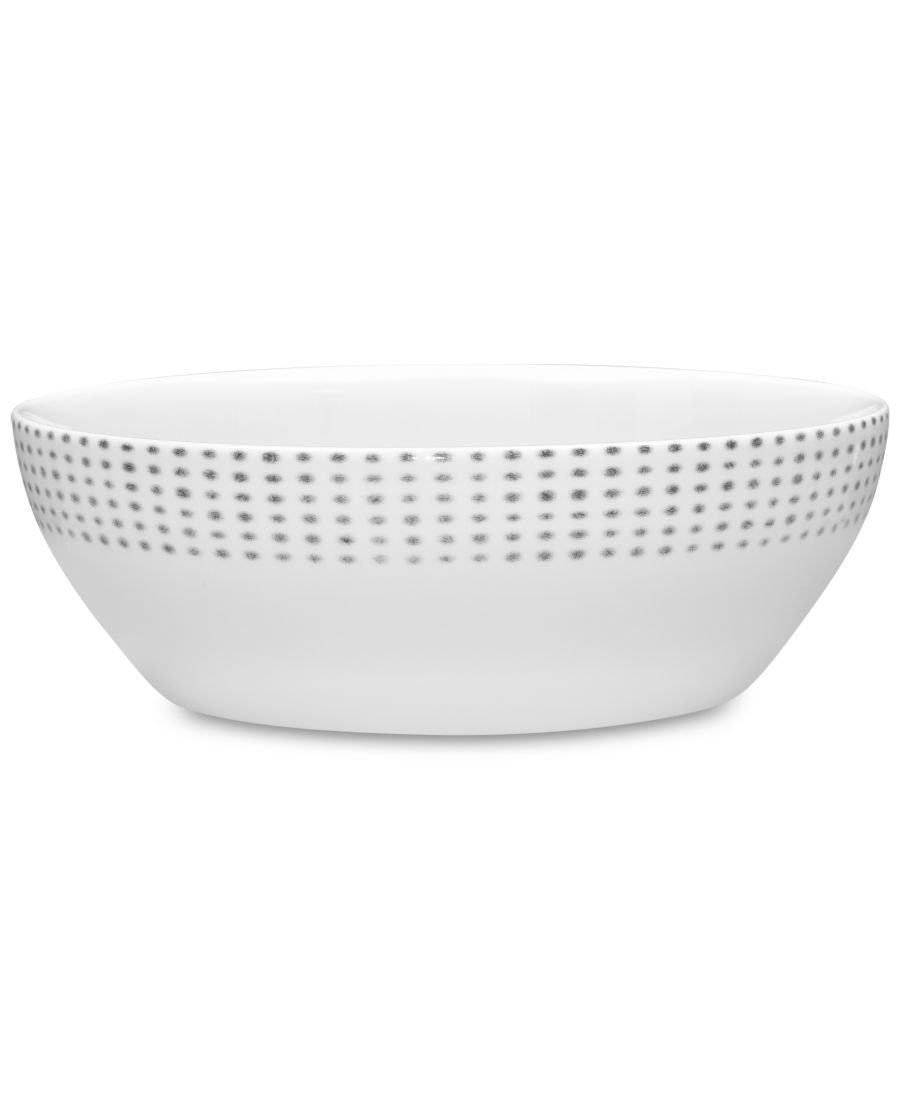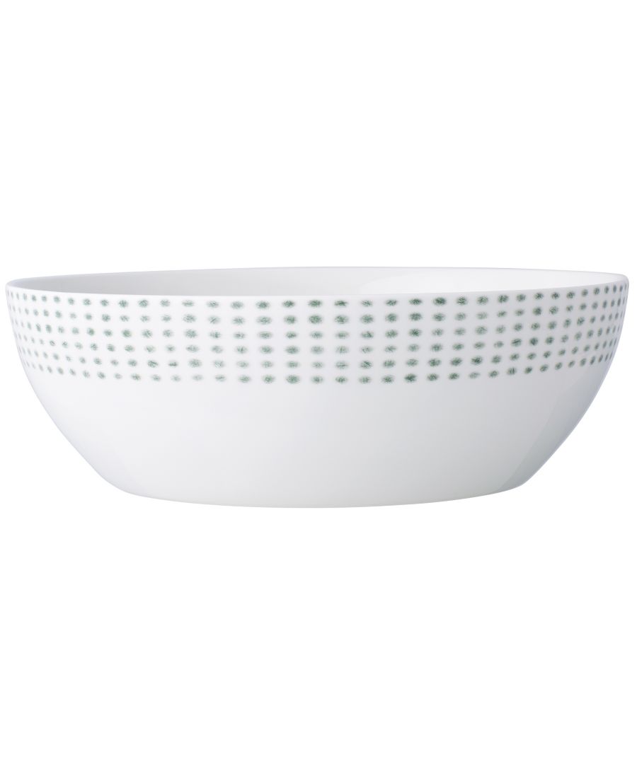 Край этой универсальной круглой овощной миски из коллекции посуды Blue Hammock от Noritake украшен узором из бледно-голубых точек.