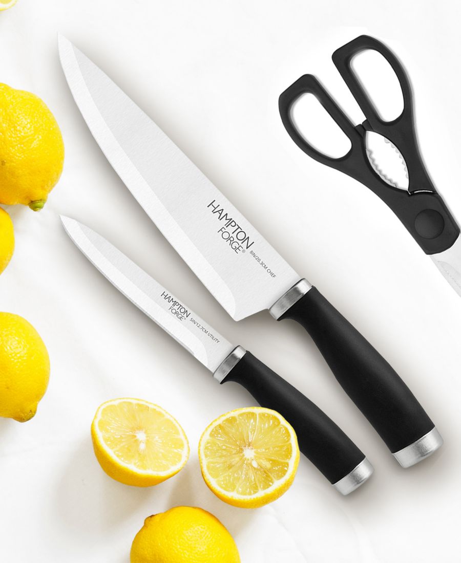 Вес изделия: 7,75 фунтов. В набор входят: 1 поварской нож, 1 нож для хлеба, 1 нож для нарезки, 1 нож сантоку, 1 нож для разделки мяса, 1 универсальный нож, 6 ножей для стейка, 1 нож для чистки овощей, 1 нож птичий клюв, 1 кухонные ножницы и 1 подставка из натуральной сосны.