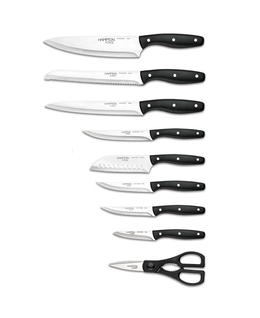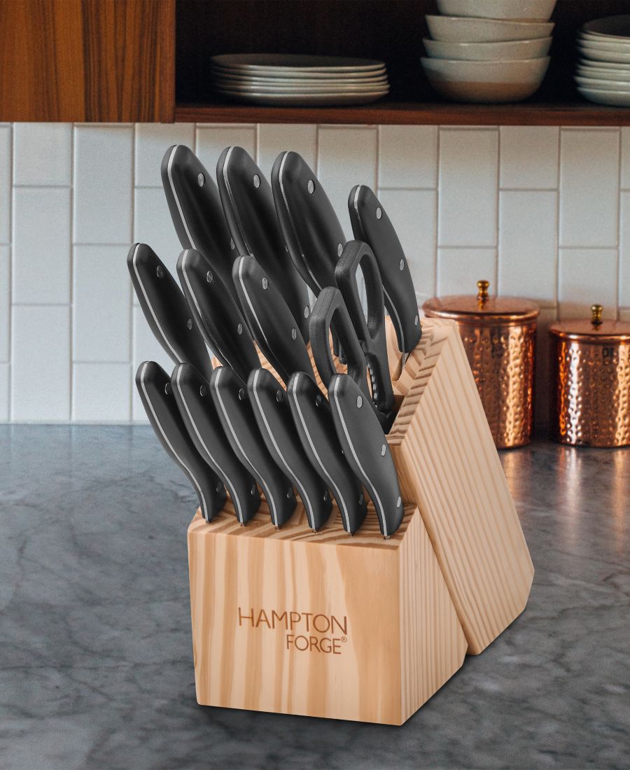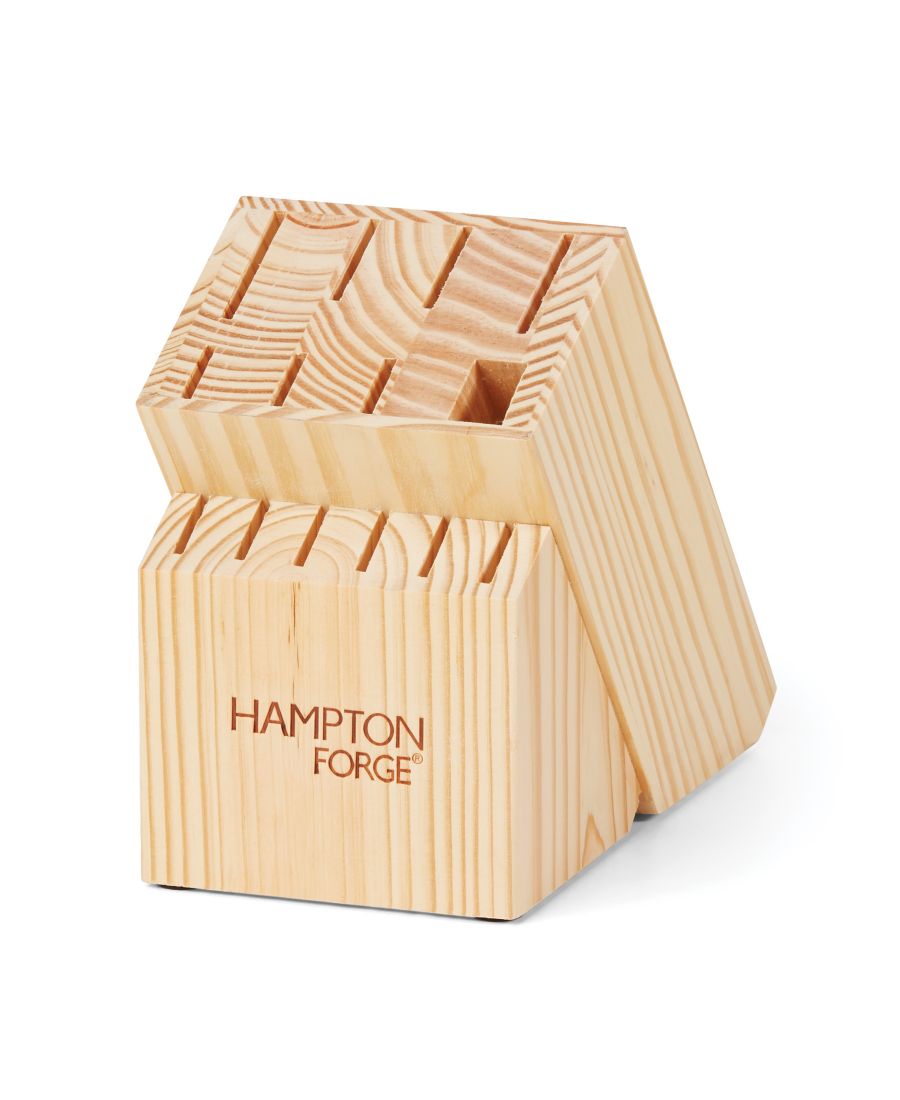 8-дюймовый поварской нож, 8-дюймовый нож для хлеба, 8-дюймовый нож для нарезки, 5-дюймовый нож сантоку, 5,5-дюймовый универсальный нож, 4,5-дюймовый универсальный нож, шесть 4,5-дюймовых ножей для стейка, 3,5-дюймовый нож для чистки овощей, кухонные ножницы, подставка из натуральной сосны