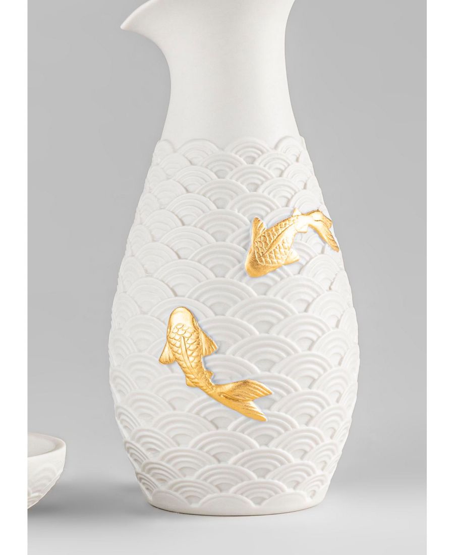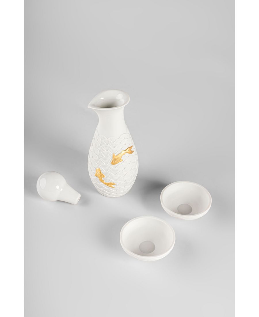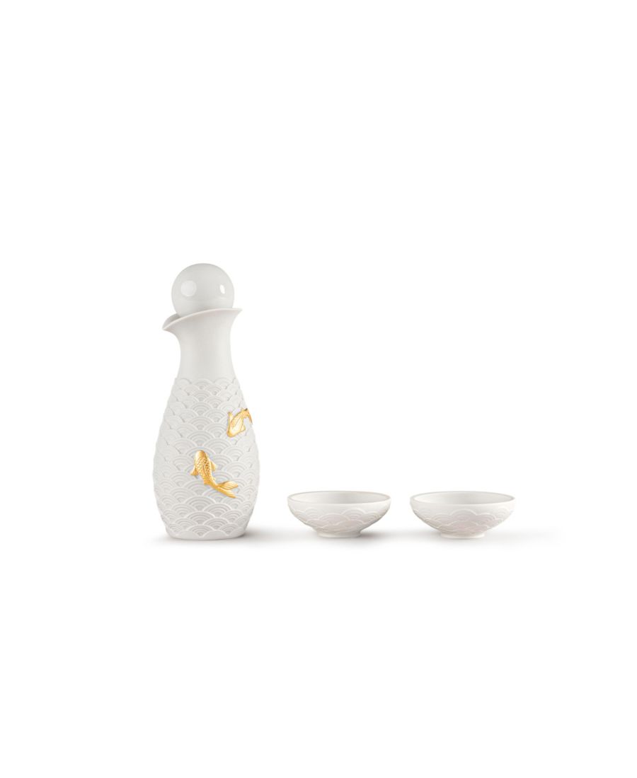 Набор фарфоровых предметов, включающий бутылку с крышкой и две небольшие миски для подачи соевого соуса. Новый фарфоровый набор, состоящий из бутылки с крышкой и двух небольших мисок для подачи соевого соуса, является последним дополнением к коллекции Koi: серии столовых принадлежностей, вдохновленных самыми ценными в мире декоративными рыбами, символом любви и дружбы. Три предмета выполнены из белого фарфора с матовой поверхностью снаружи и глазурованной внутренней поверхностью, а также имеют элегантный геометрический декор, вдохновленный чешуей карпов кои. Кроме того, на бутылке изображены два карпа кои с золотистым блеском.