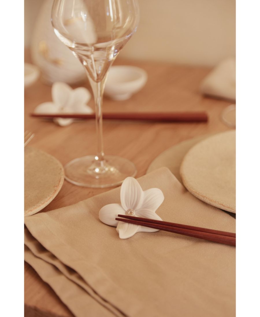 Набор из двух фарфоровых подставок для палочек в форме цветов. Цветы, культовые элементы многих наших изделий, послужили вдохновением для этих подставок, воссоздающих раскрытые лепестки лилии. Вылепленные из белого фарфора с золотистым блеском, эти подставки с невероятной тщательностью точно воспроизводят неповторимую форму этого цветка. Эти подставки для палочек - не просто функциональные аксессуары, они также придают оригинальный и элегантный вид любому столу. В набор входят две подставки и четыре деревянные палочки.