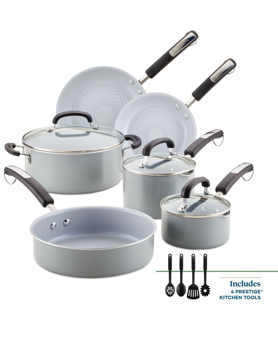Этот набор посуды также включает четыре кухонных принадлежности Prestige, в том числе лопатку с прорезями, ложку с прорезями, вилку для пасты и обычную ложку.