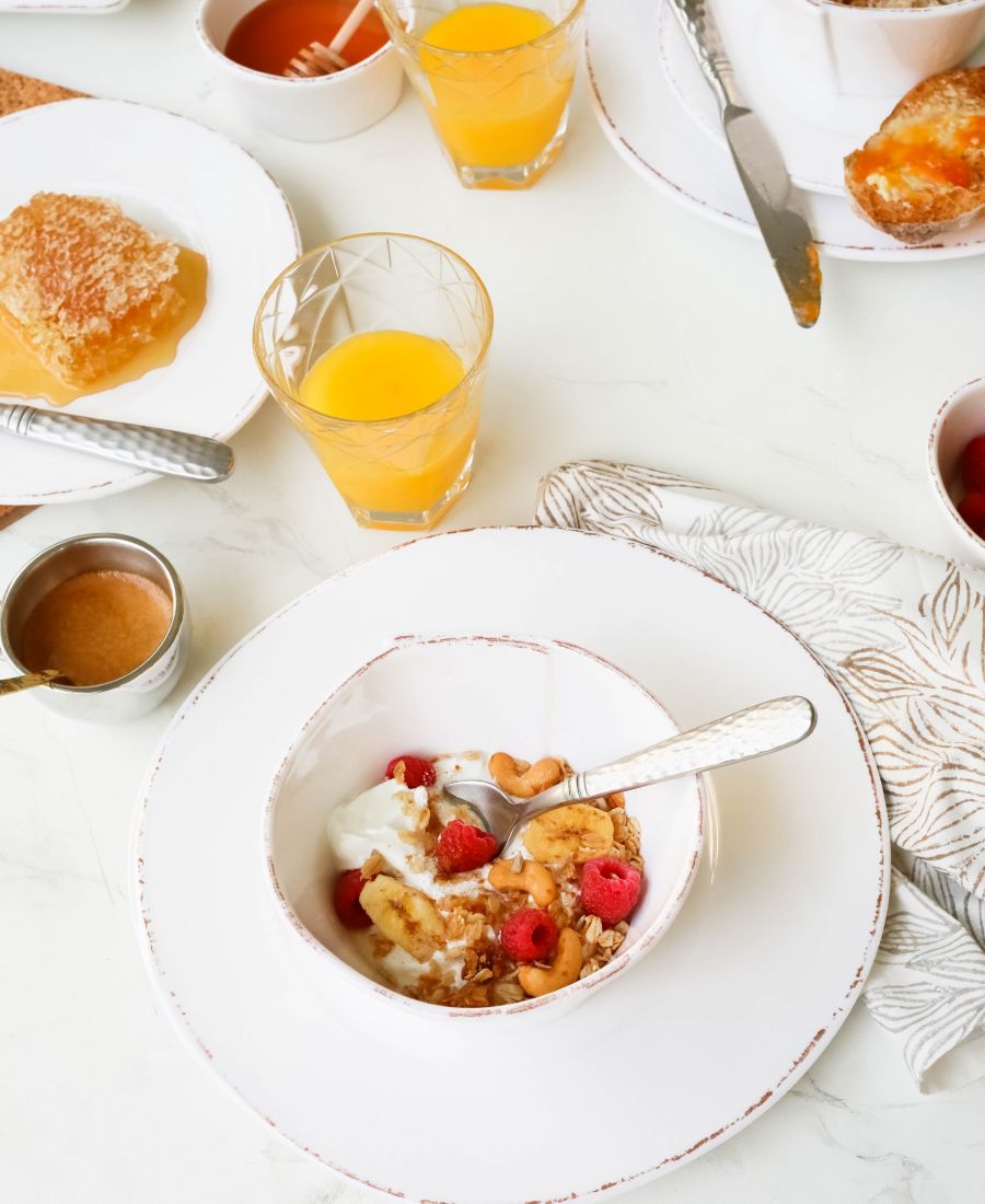 В комплект входят: 1 обеденная тарелка, 1 салатная тарелка и 1 миска для хлопьев.