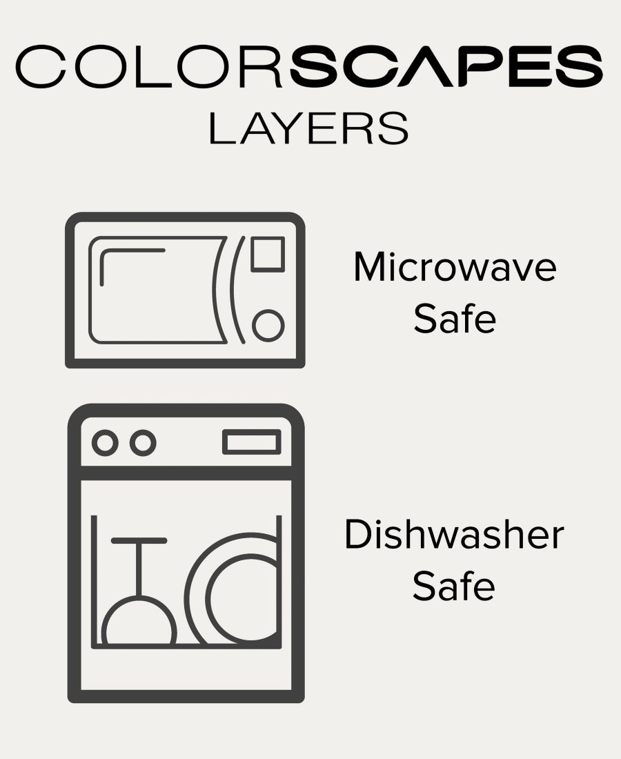 Коллекция Colorscapes Layers отличается многообразием цветов, современным дизайном и долговечностью. Каждое изделие имеет тонкую текстуру, состоящую из закручивающихся концентрических кругов. В каждом цветовом варианте присутствует градиент цветовых полос. Все изделия изготовлены из прочного белого фарфора и предназначены для повседневного использования.