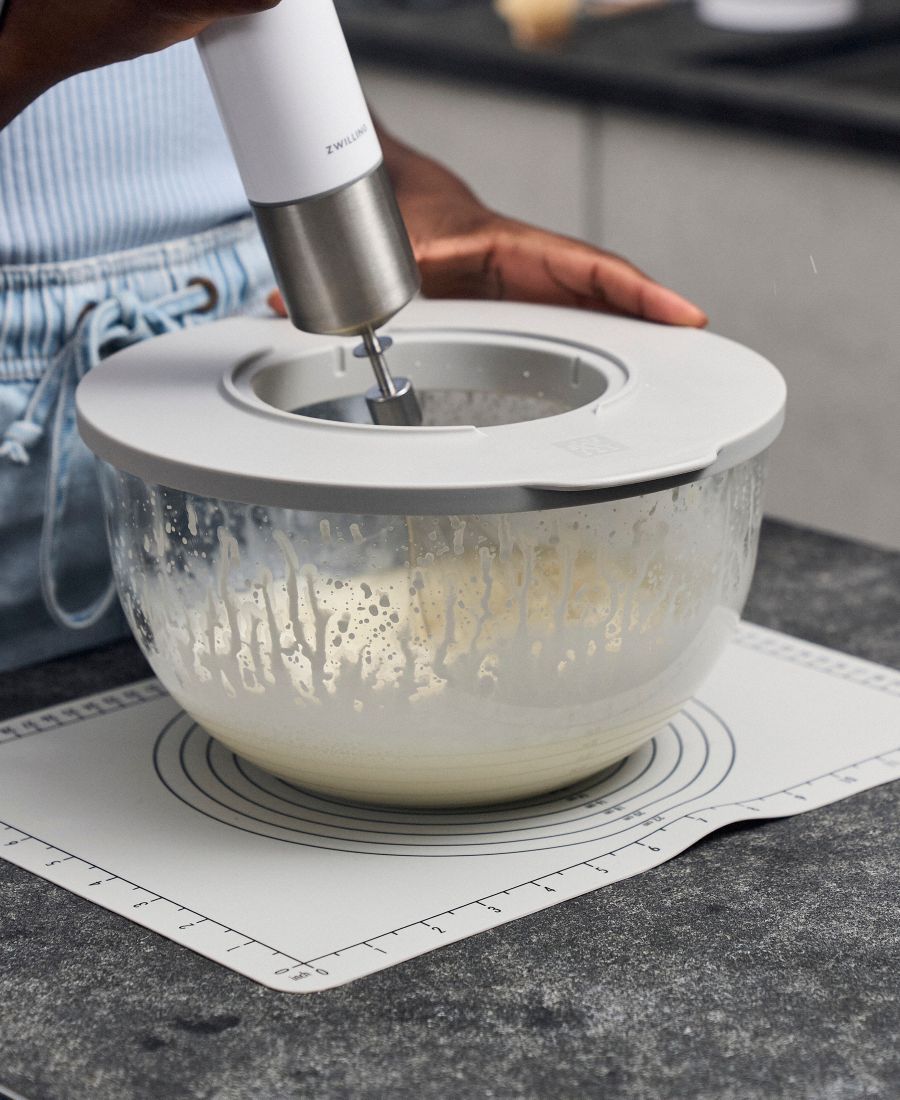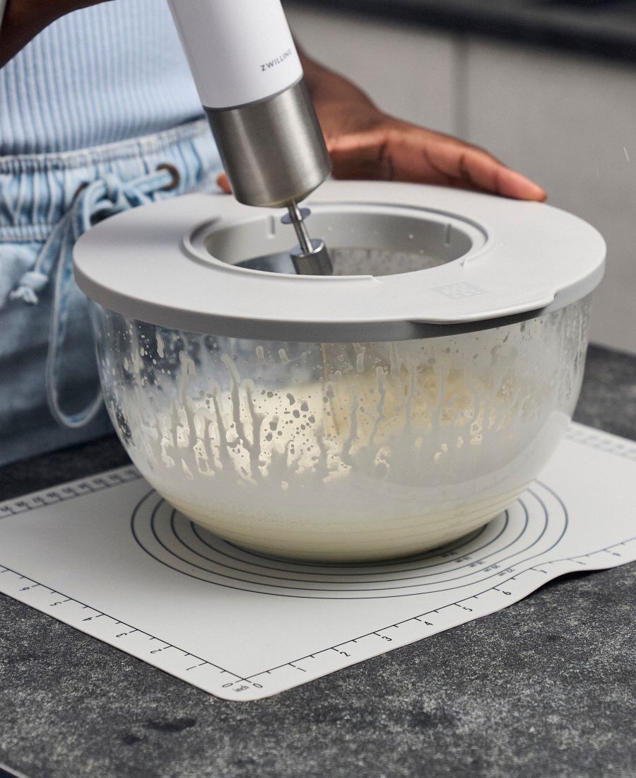 Защитный кожух предотвращает разбрызгивание содержимого во время смешивания или взбивания, уменьшая количество брызг на столешнице