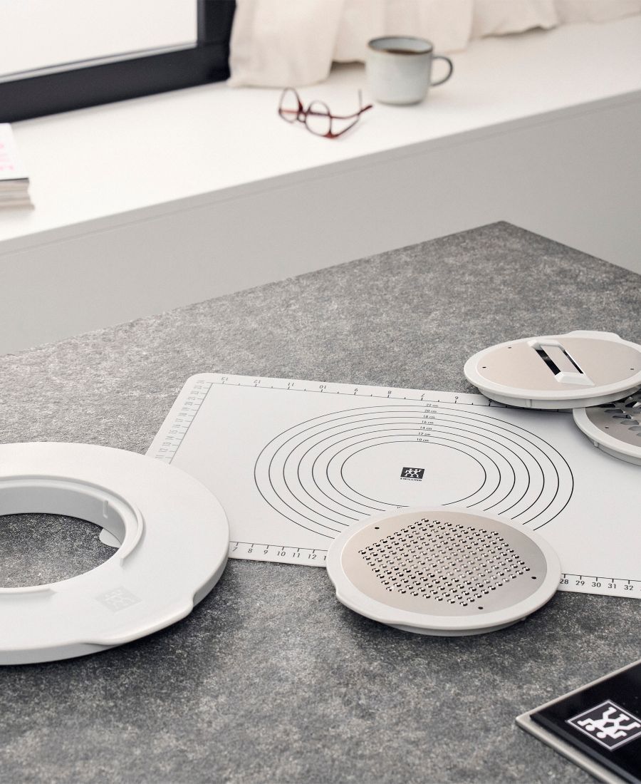 В комплекте: вставка для мелкой терки, вставка для крупной терки, вставка для тонкой терки, защитный экран от брызг Защитный коврик для выпечки