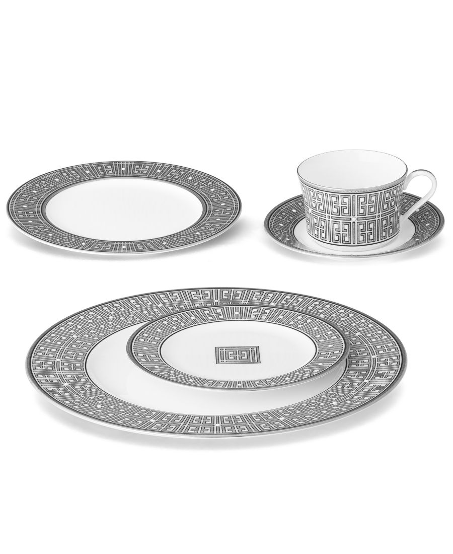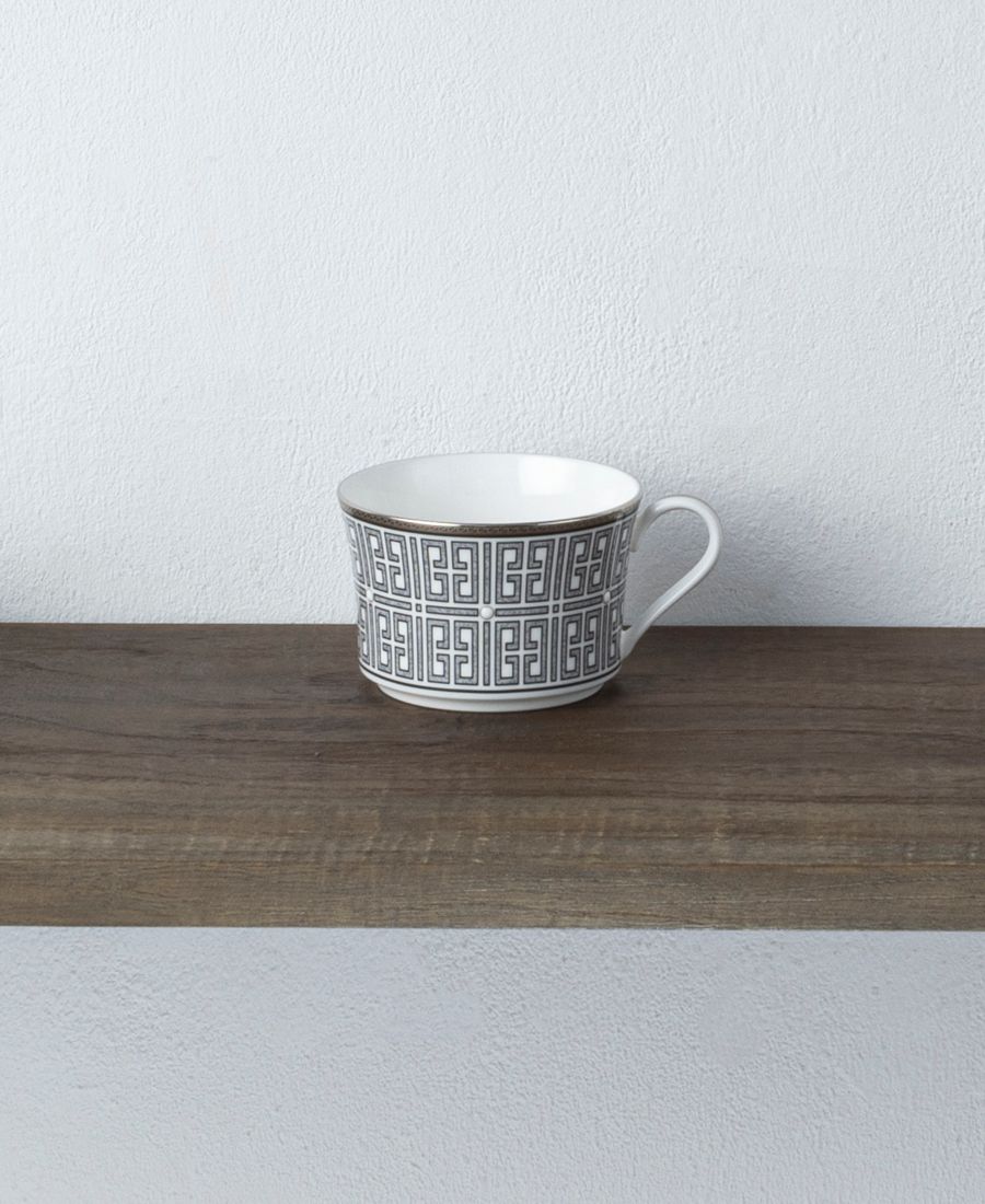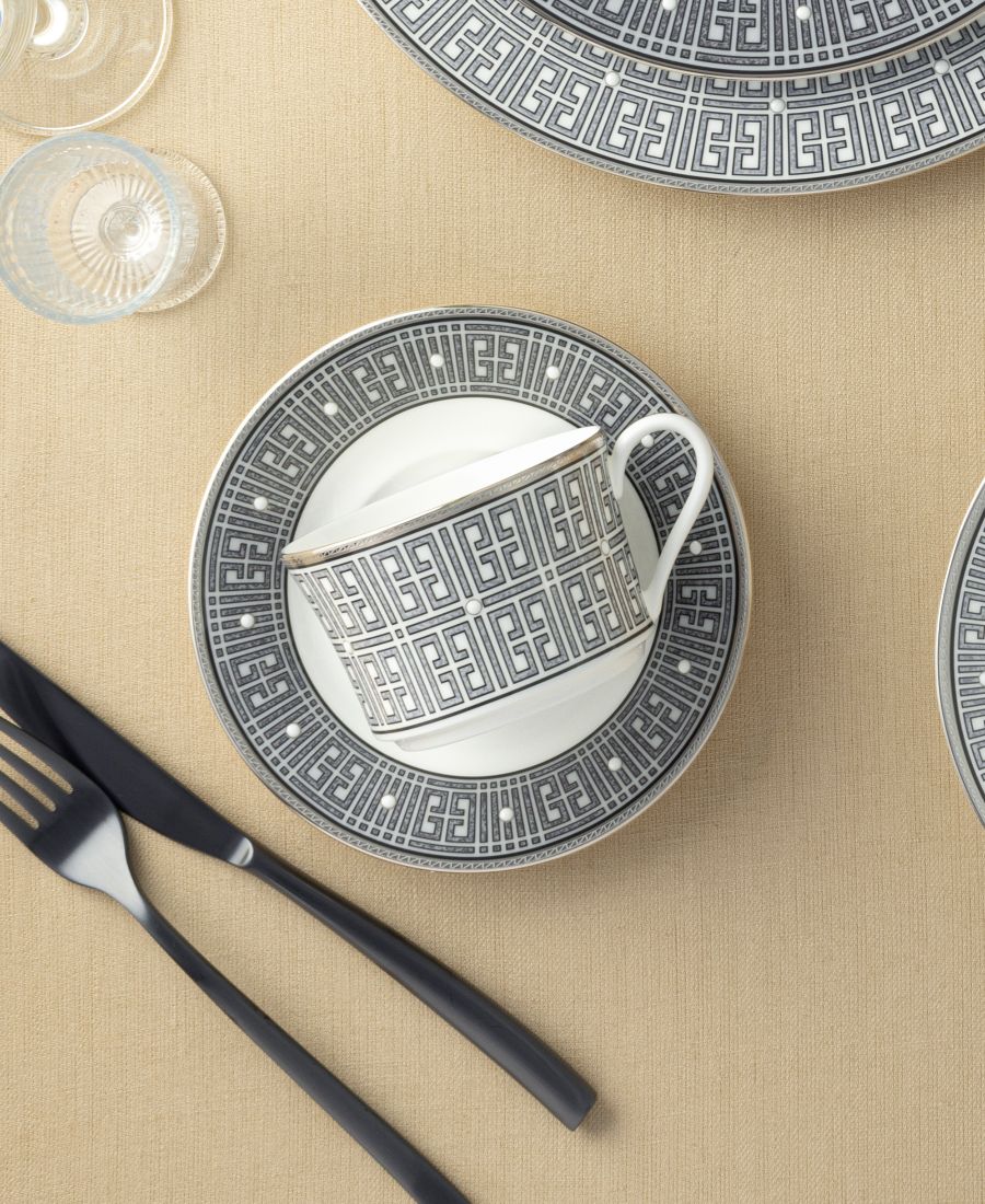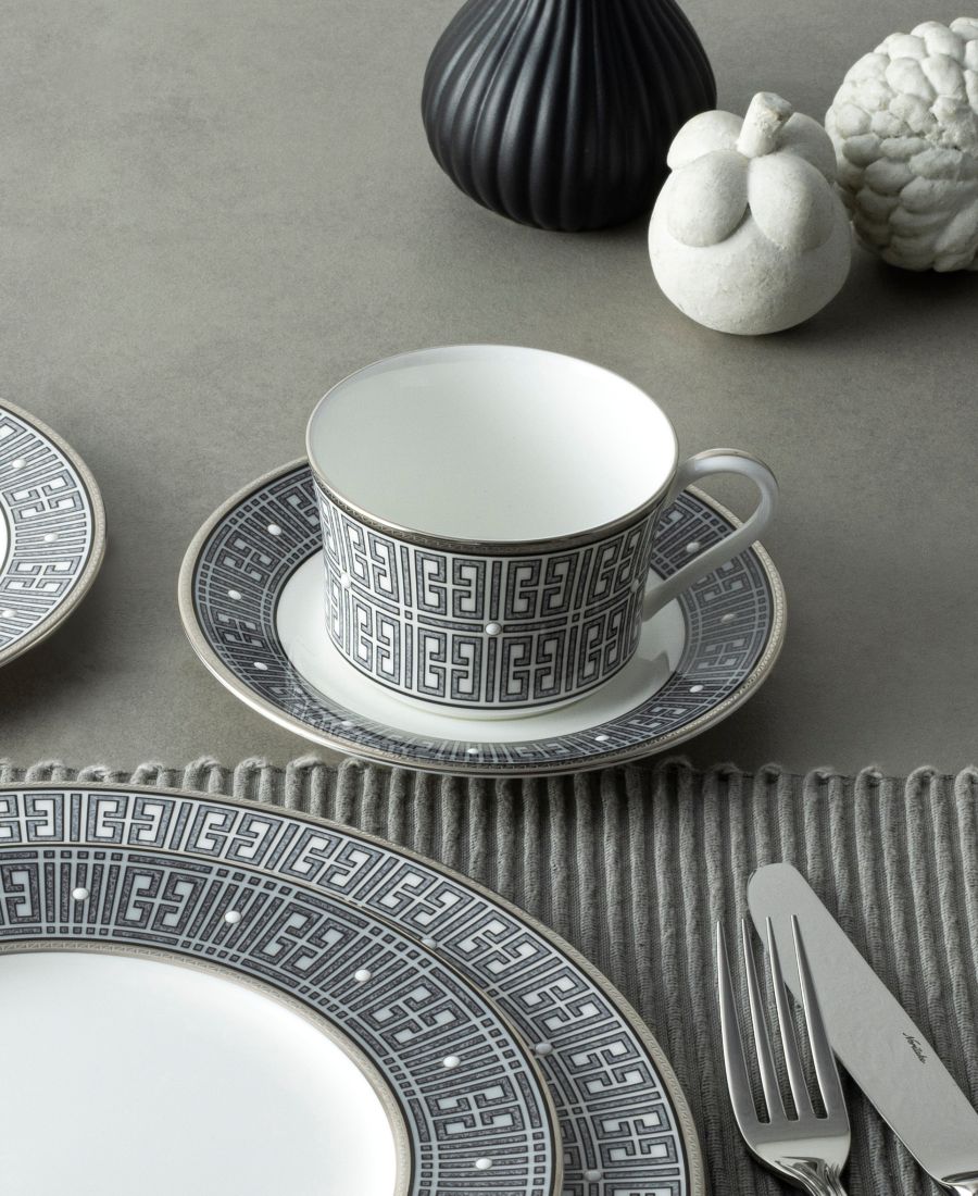 Бесконечность - смелый узор на костяном фарфоре. Каждое изделие украшено ажурным узором, интерпретированным как переплетающиеся ключи и блоки. Внутри каждого блока находится мраморный рисунок в оттенках серо-коричневого цвета. Кроме того, бронзовые изделия с узором Бесконечность украшены выпуклыми эмалевыми точками.