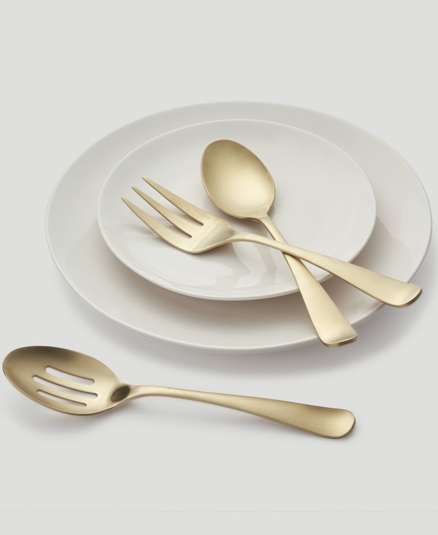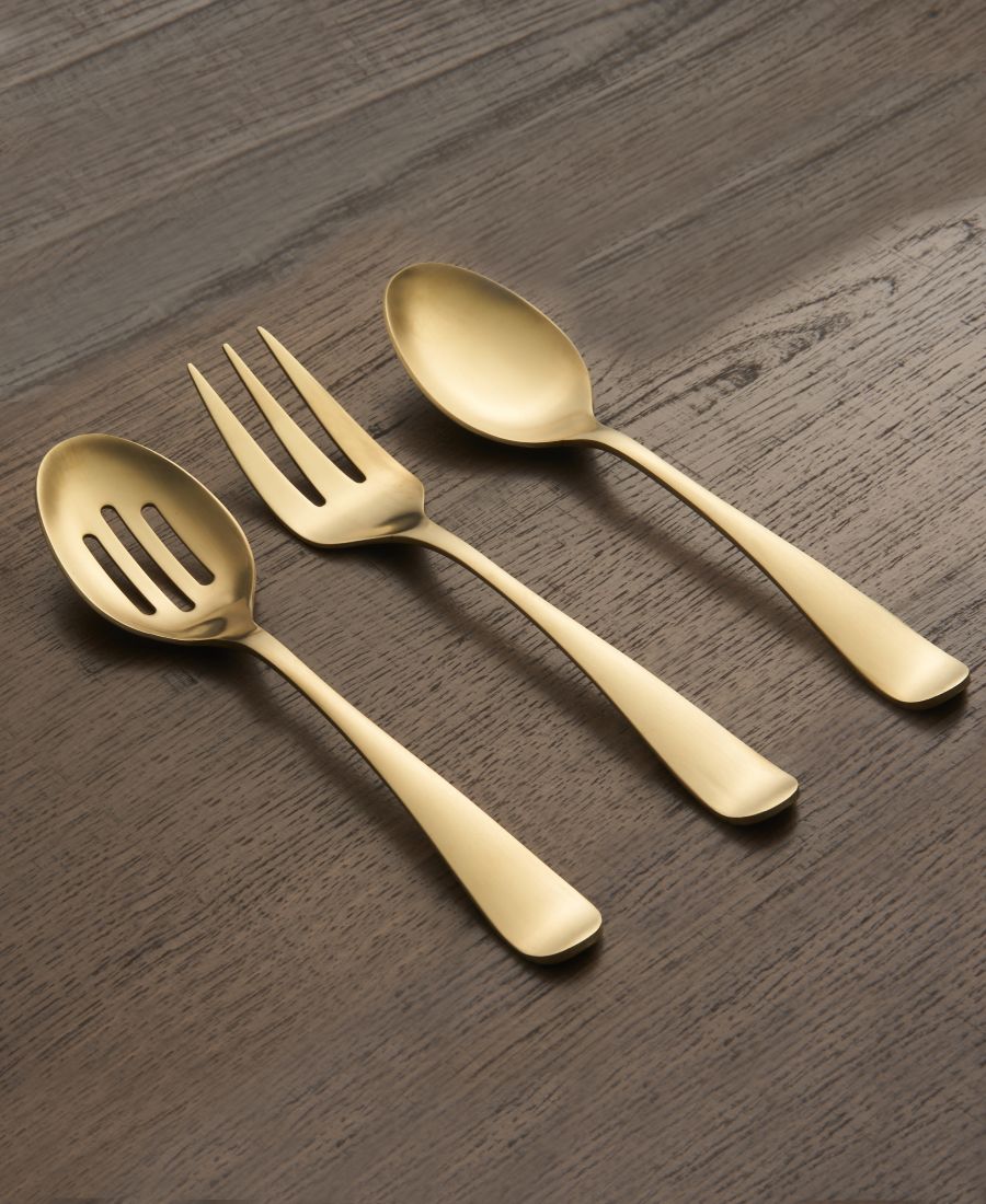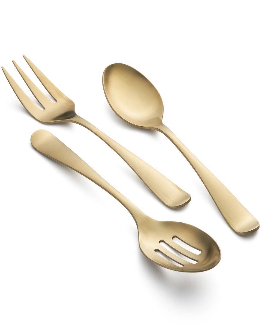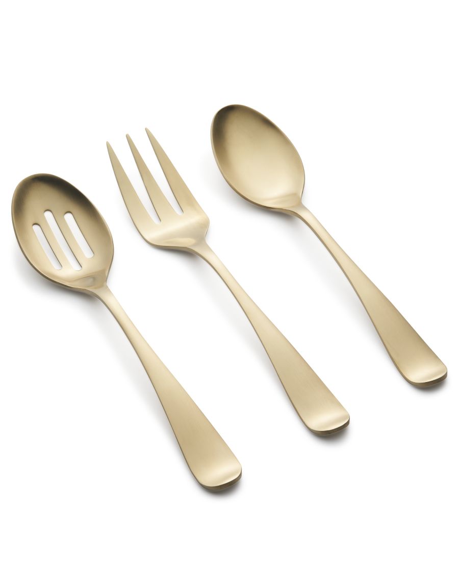 Этот сервировочный набор из 3 предметов включает в себя: сервировочную ложку, ложку с прорезями и сервировочную вилку.