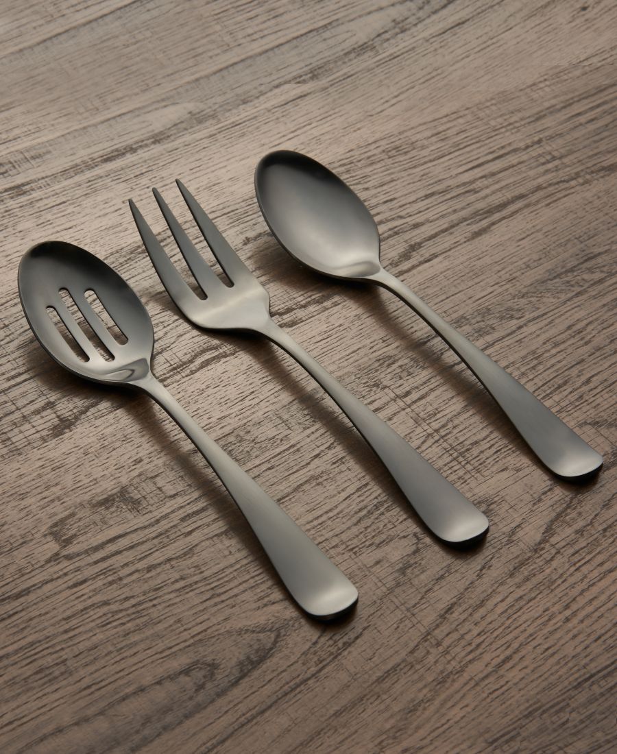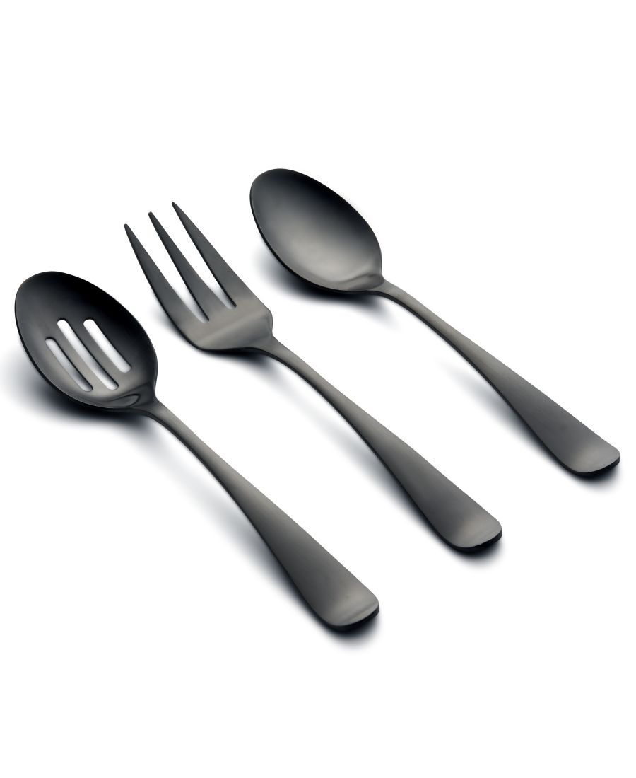 Этот сервировочный набор из 3 предметов включает в себя: сервировочную ложку, ложку с прорезями и сервировочную вилку.