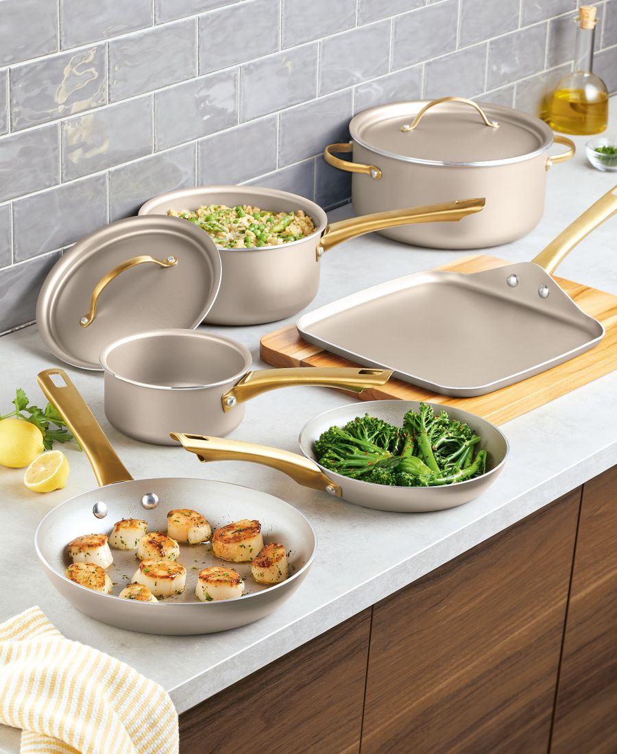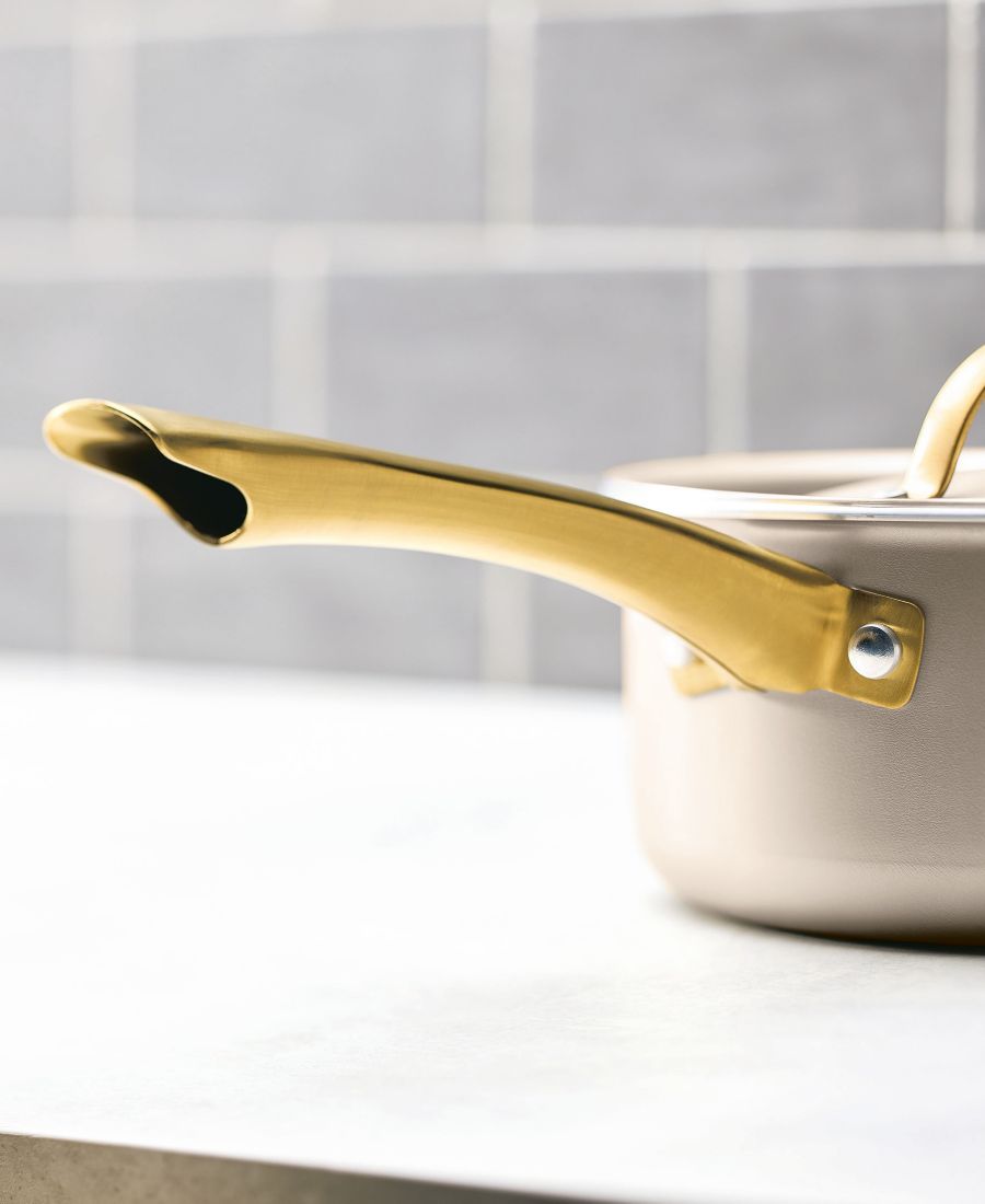 Эффектные кастрюли и сковородки, излучающие стиль и обеспечивающие надежность в повседневной жизни, с прочным антипригарным покрытием; быстрым и равномерным распределением тепла; и современной поверхностью цвета шампанского с элегантными ручками, украшенными золотыми акцентами.