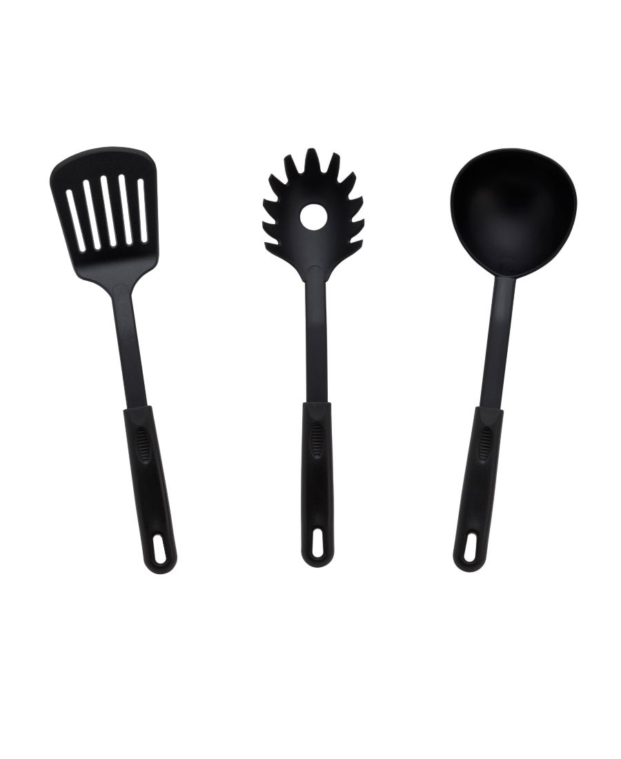 5 нейлоновых инструментов, безопасных для использования в соответствии с требованиями FDA: ложка, ложка с прорезями, лопатка с прорезями, половник, вилка для пасты: 30 см (Д) x 5 см (Ш).