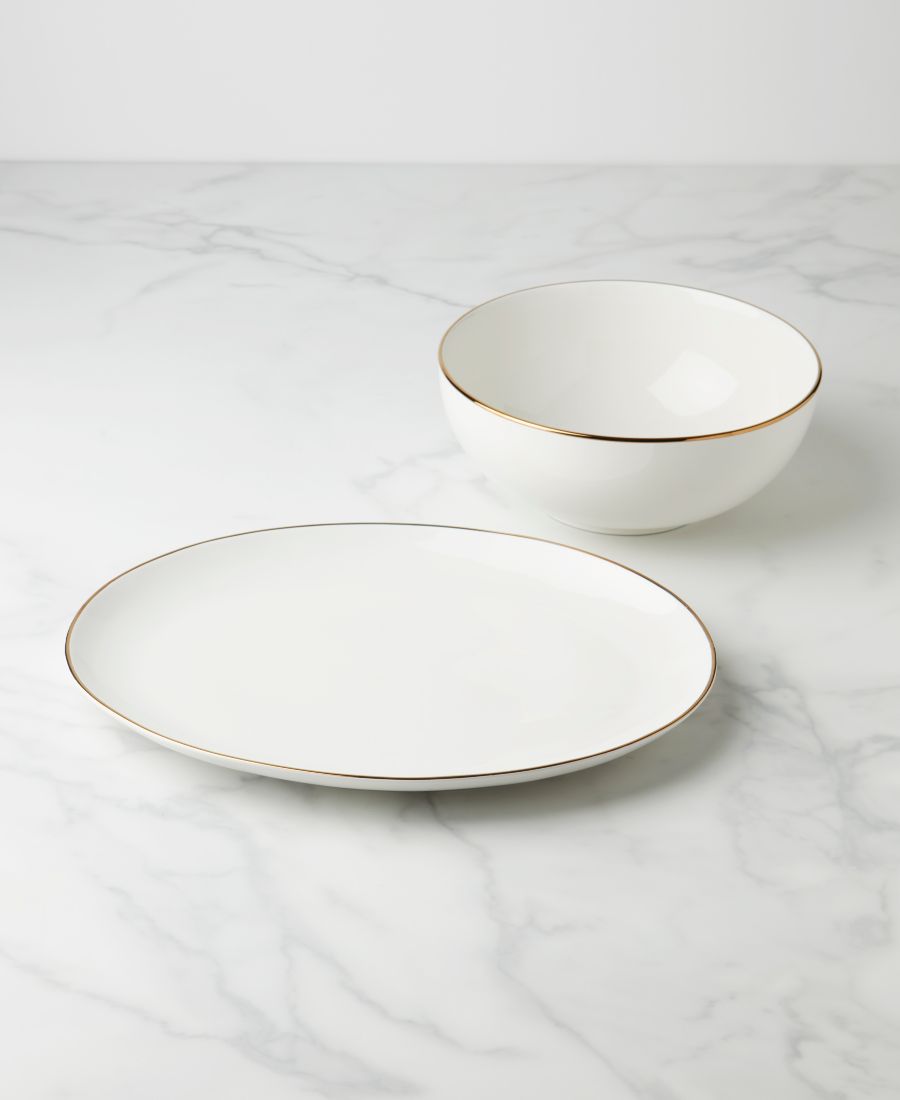 На старт, внимание, подача! Этот сервировочный набор Trianna выполнен из гладкого белого фарфора и украшен привлекательными золотистыми акцентами по краям. Создан для удовлетворения всех ваших потребностей в сервировке.