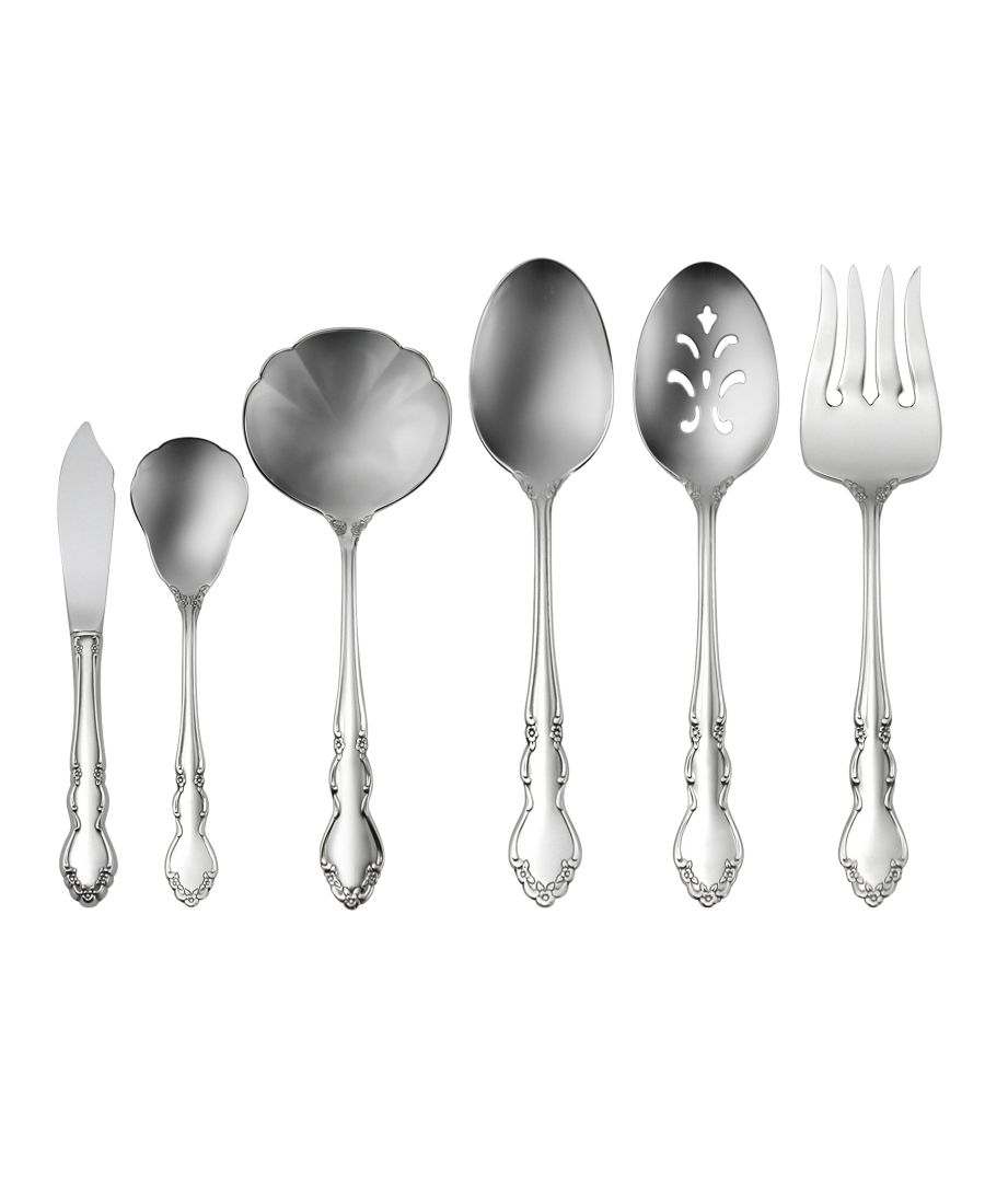 В комплект входят сервировочная ложка, сервировочная ложка с отверстиями, сервировочная вилка, половник для соуса, ложка для сахара и нож для масла.