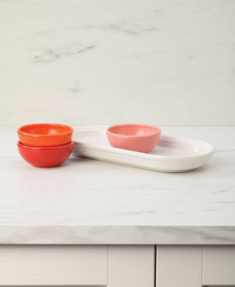 Этот элегантный и универсальный набор от Fiesta включает в себя три миски и поднос, на которых можно подавать все что угодно: от топпингов для мороженого до заправок и соусов в культовом стиле.
