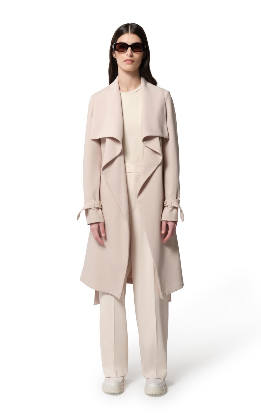 Свободный крой. Длина до колена. Каскадный воротник. Застежка на запах с потайной пуговицей на воротнике. Съемный пояс. Ветрозащитная планка сзади. Регулируемый пояс на рукаве с пуговицами. Наклонные прорезные карманы. Подкладка на половину спины. СВОБОДНЫЙ КРОЙ - Свободный крой для комфорта в движении. Длина: Средняя - Предполагается, что длина доходит до середины бедра и до колена. Длина пальто от плеча до низа: 99 см.