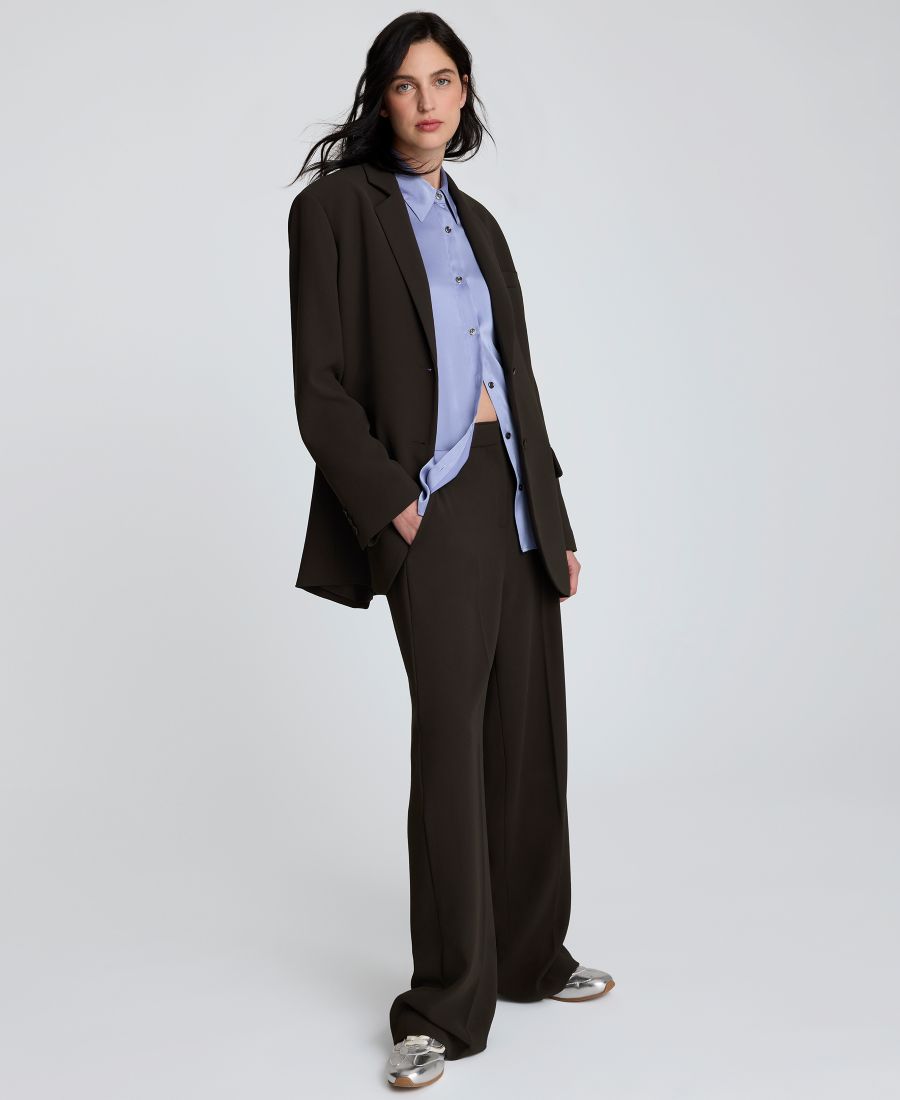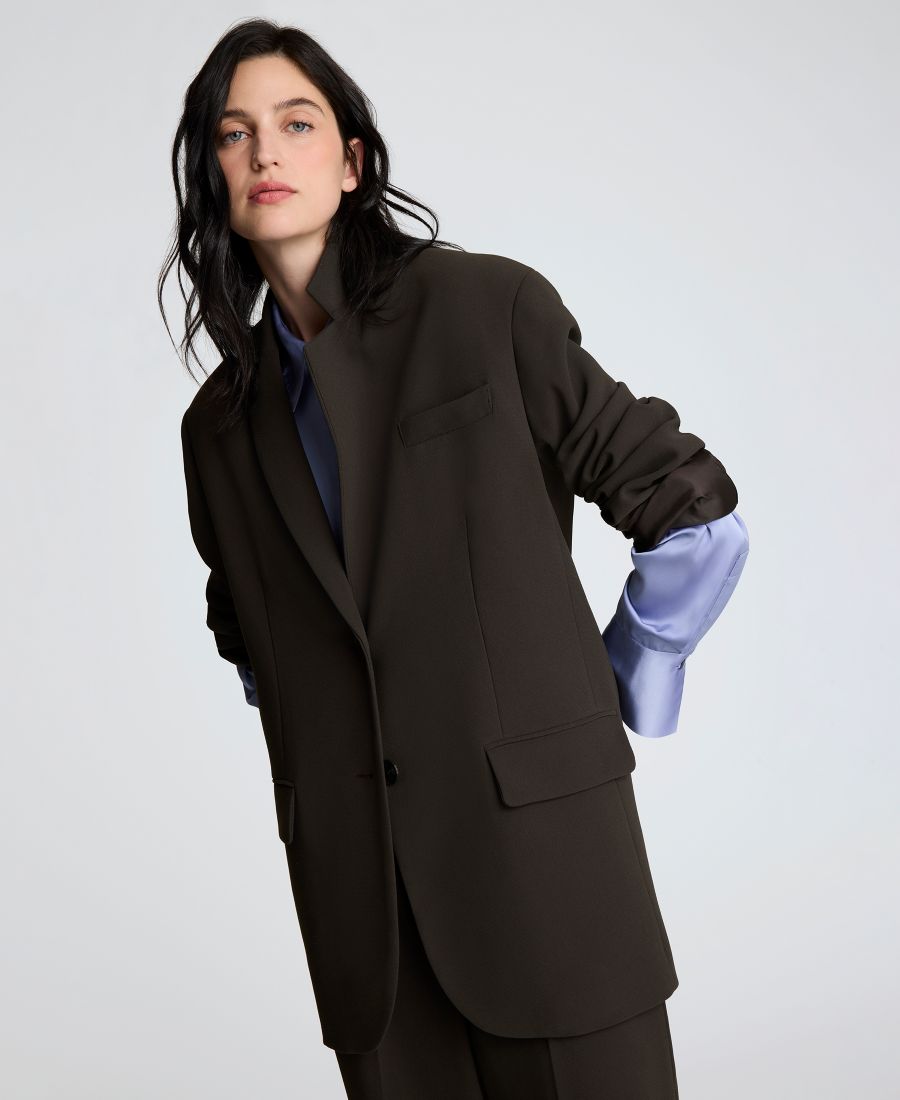 Создайте изысканный и утонченный образ с помощью этого пиджака в стиле бойфренд от Kenneth Cole с воротником-стойкой. Застежка на две пуговицы завершает образ, а подплечники придают ему четкость и структуру.