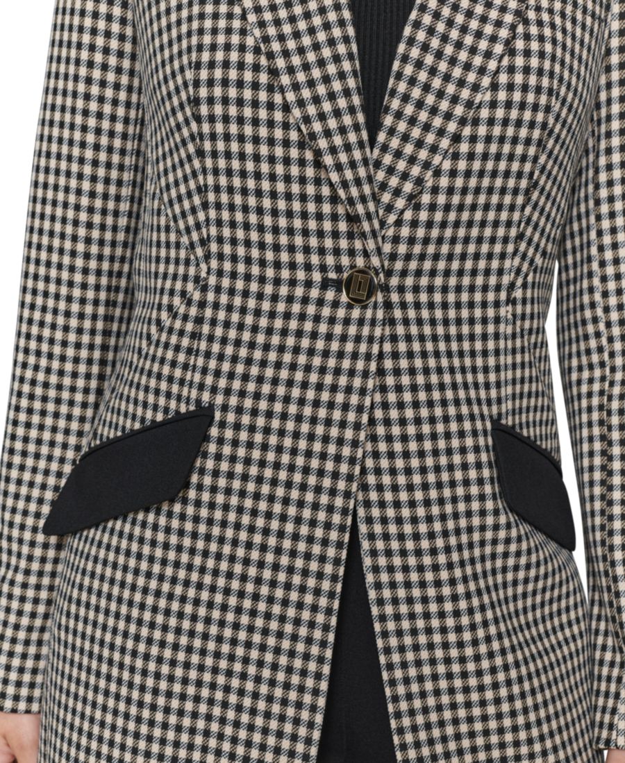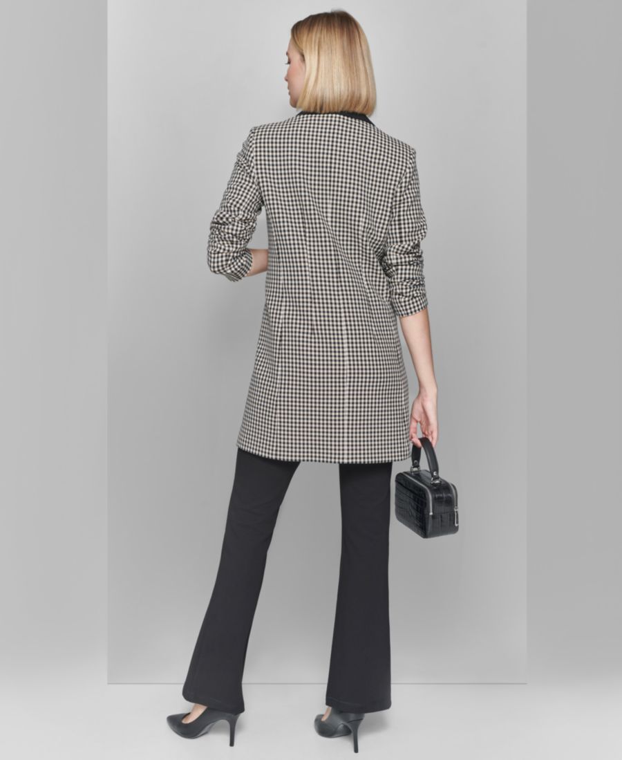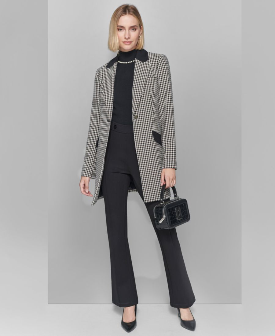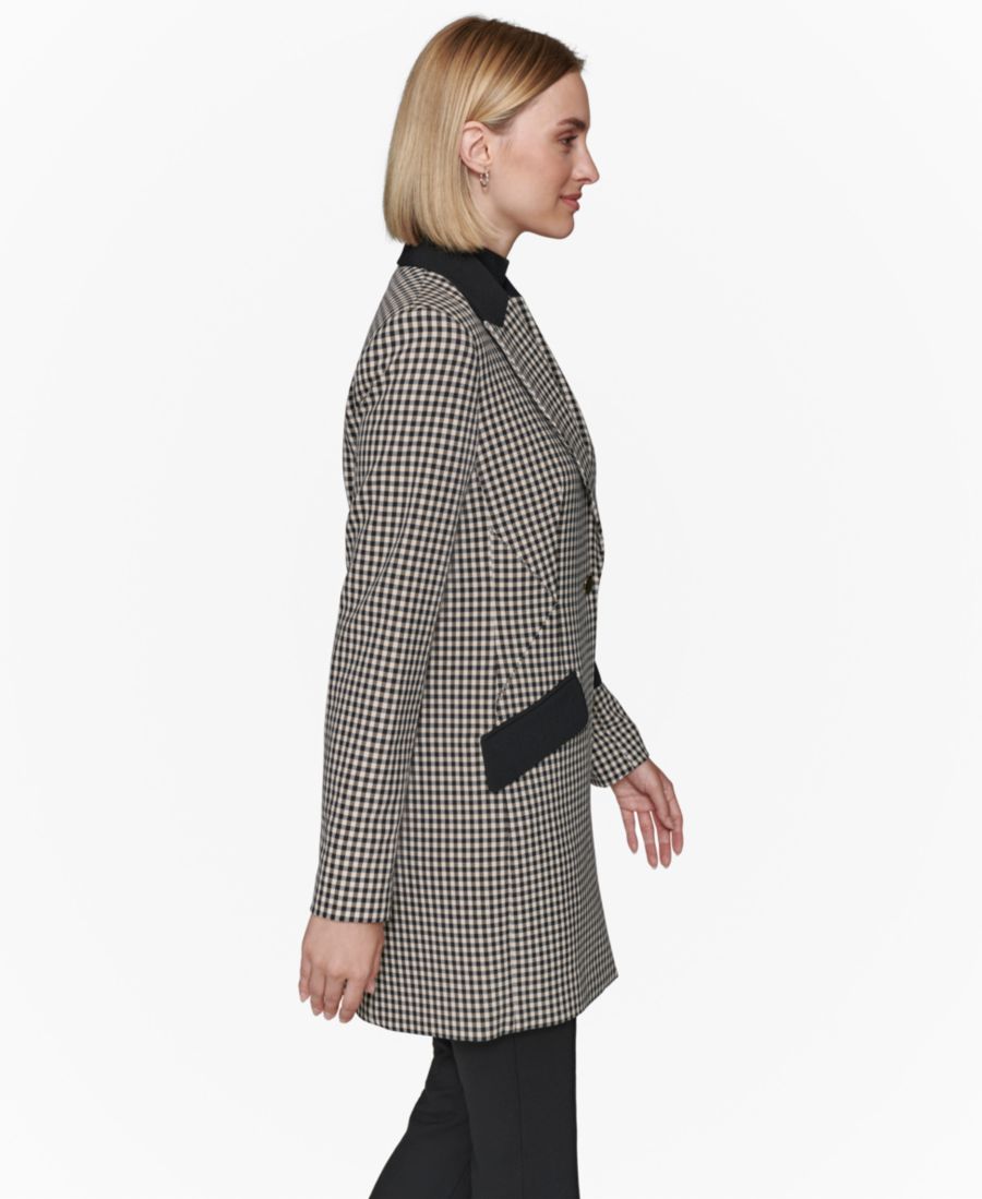 Обновите свой деловой гардероб с помощью этого удлиненного блейзера от KARL LAGERFELD PARIS, украшенного контрастными деталями и клетчатым принтом.