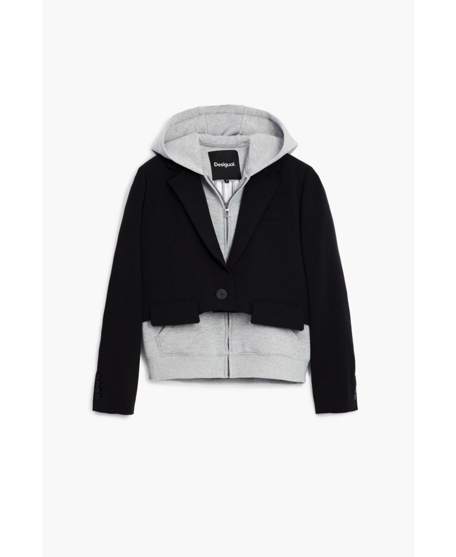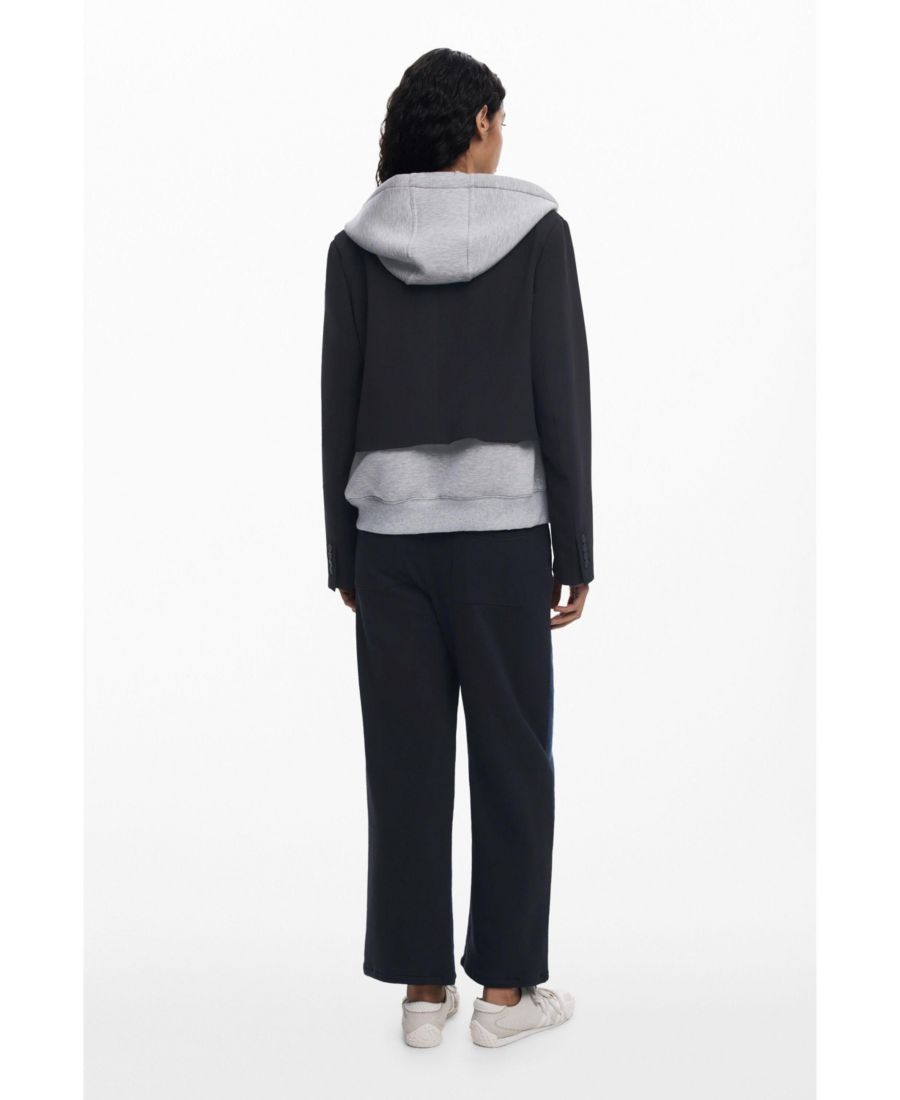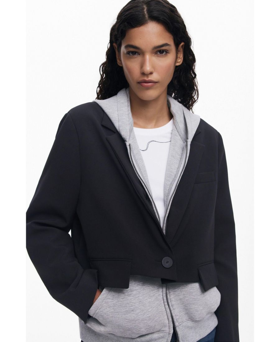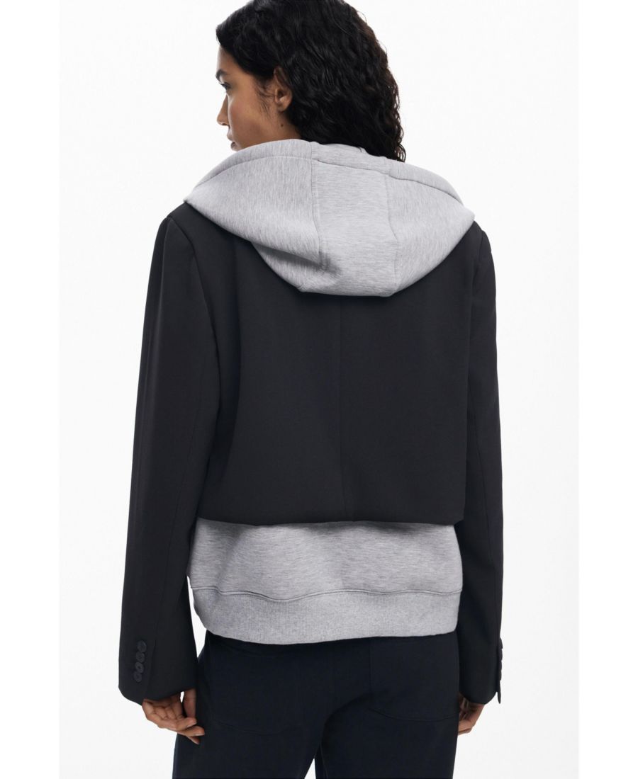 Двухцветный блейзер, сочетающий трикотаж с отделкой под толстовку, передние карманы, капюшон, застежка на молнию и пуговицу.