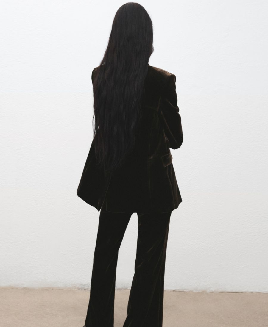 Двубортный бархатный пиджак от Mango, созданный для элегантного и стильного образа, дополняет классику формальной одежды.