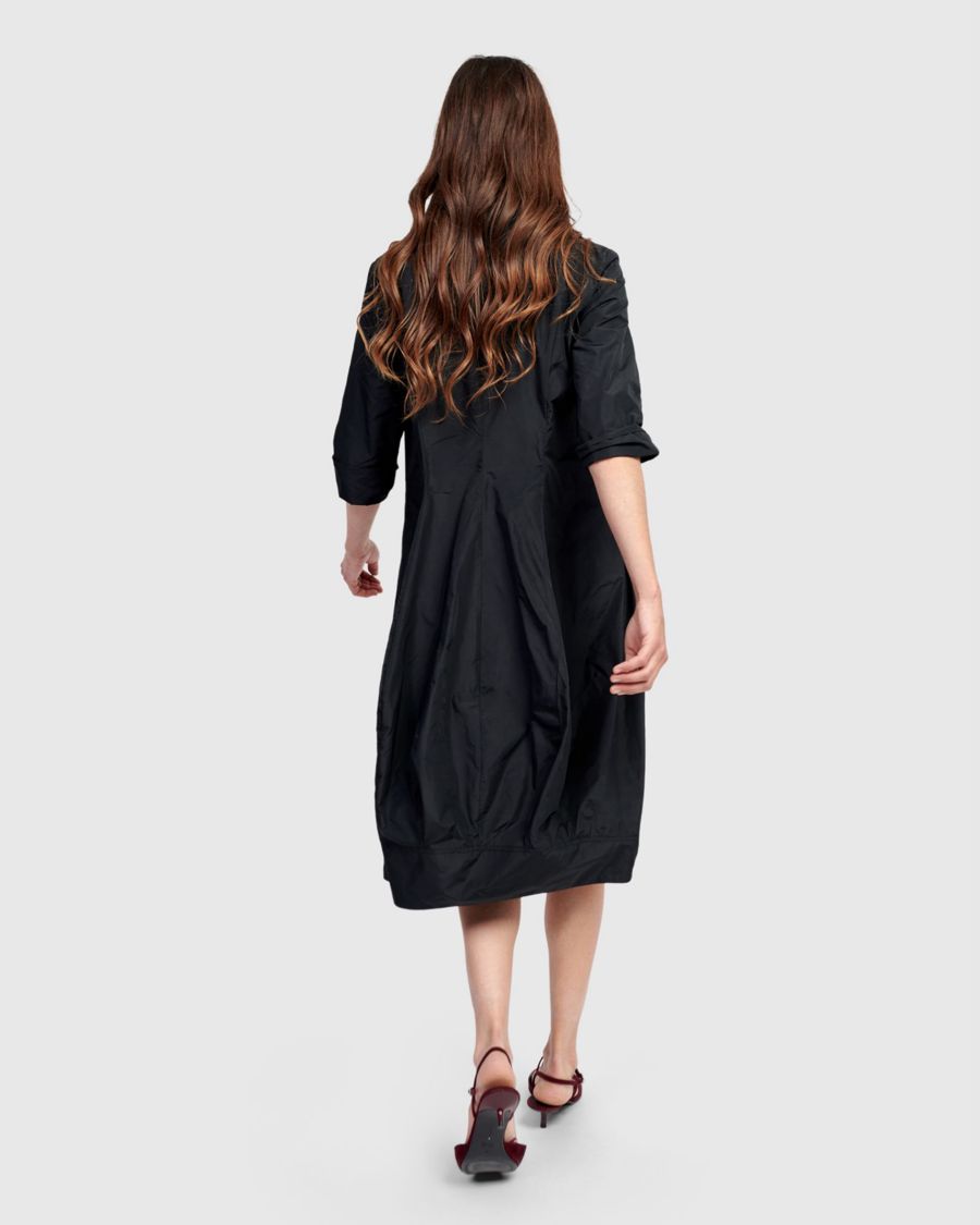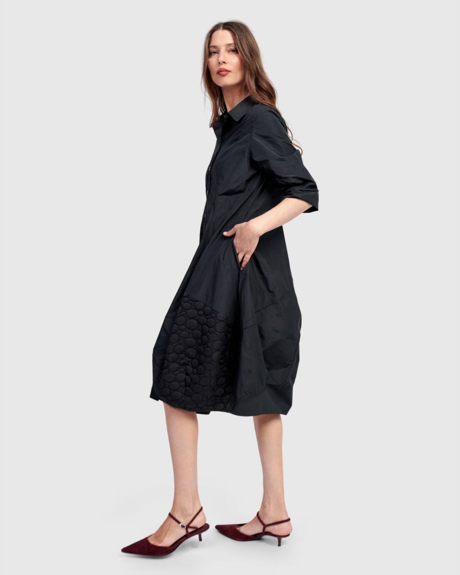 Это свободное платье-рубашка выполнено из тканого тафтового полотна с вставками из ткани с комбинированным принтом по низу. Оно облегает грудь и плечи, имеет аккуратные швы, расширяется от талии и переходит в юбку-кокон. Отложной воротник с полной застежкой на пуговицы, рукава три четверти, боковые карманы, длина миди. Застегните пуговицы до середины и сочетайте с брюками для более элегантного образа.