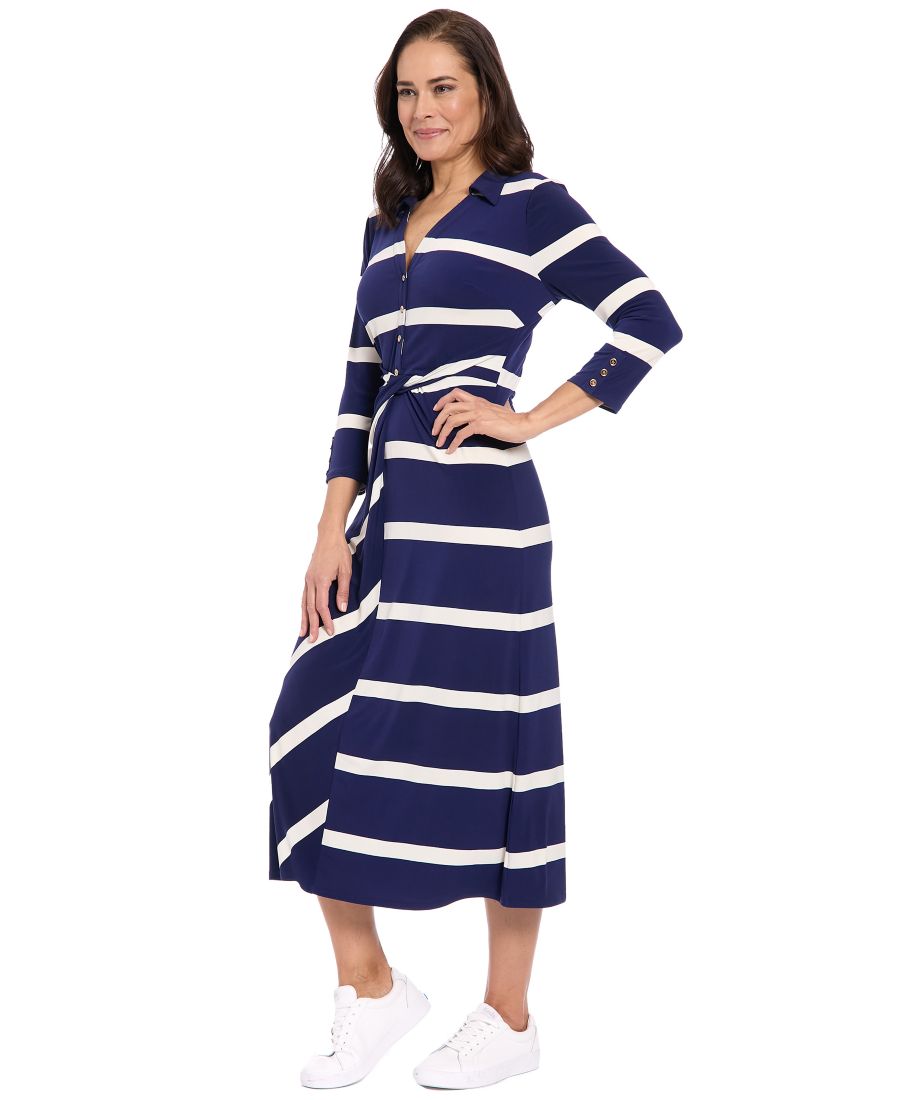 Это платье-миди от London Times, выполненное в классическом стиле рубашки, имеет воротник и функциональную застежку на пуговицах спереди. Рукава три четверти и полосатый узор создают универсальный образ, подходящий как для работы, так и для ужина.