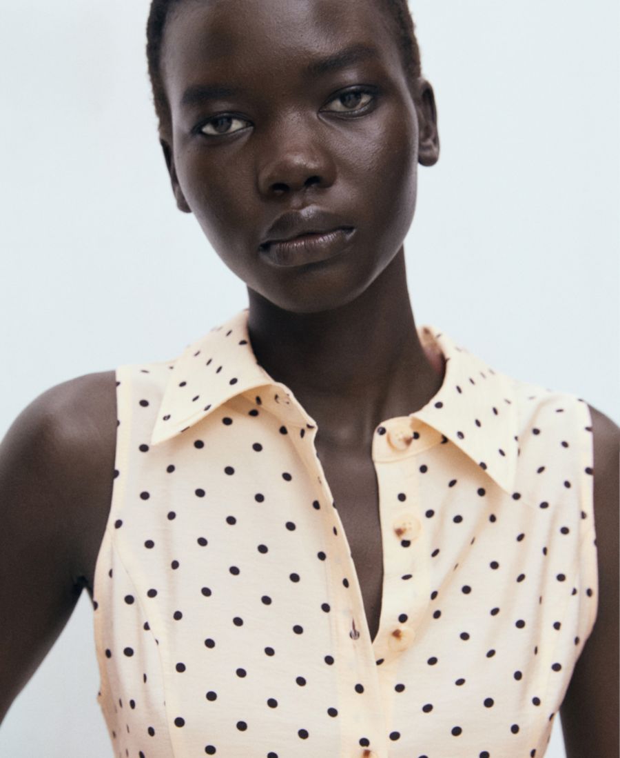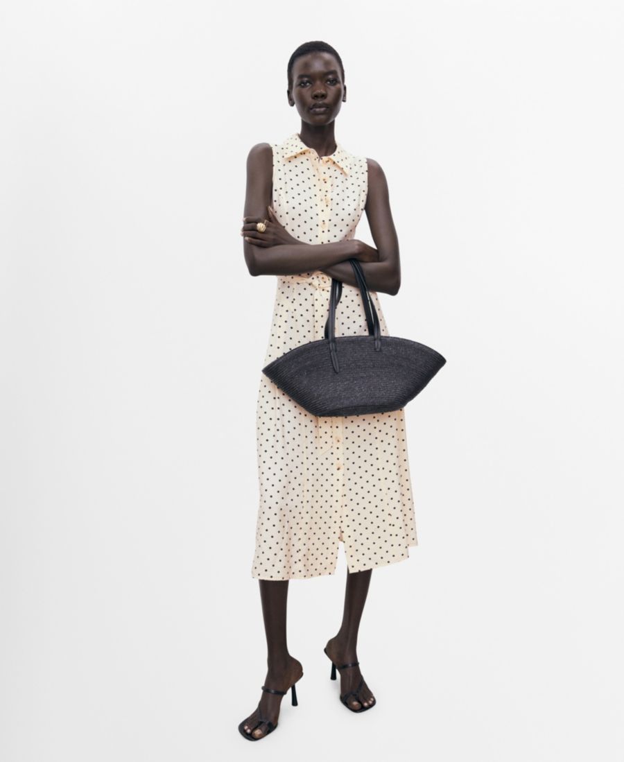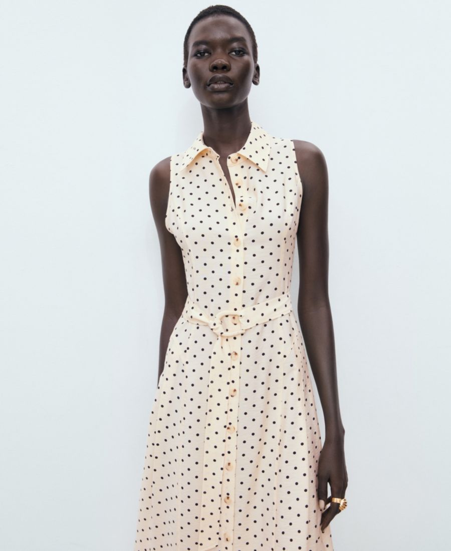 Классический горошек приобретает изысканный вид в платье-рубашке в горошек от Mango. Это платье миди, сшитое из смесовой ткани, имеет А-образный силуэт, принт в горошек, крой без рукавов, широкие бретели и регулируемый пояс.