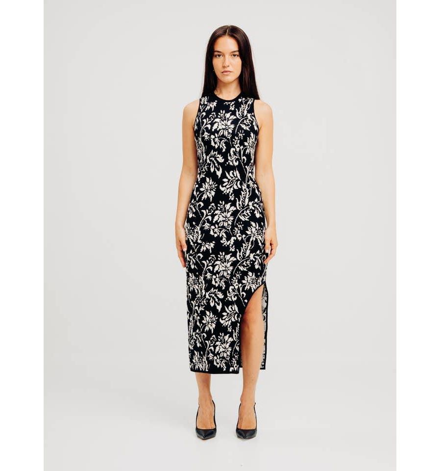 Платье NOVA DRESS - это великолепное фактурное трикотажное платье миди, созданное для того, чтобы привлекать внимание. Классический круглый вырез и длинные рукава обеспечивают сбалансированную закрытость и современный стиль. Основная часть платья выполнена из жаккардовой ткани с цветочным узором, создающим завораживающий рельефный рисунок, который добавляет глубины и элегантности. Смелый боковой разрез слева добавляет тонкий, но соблазнительный штрих, делая это платье изюминкой любой коллекции - идеально подходящим для коктейльных вечеринок, галерейных мероприятий или изысканных вечеров.