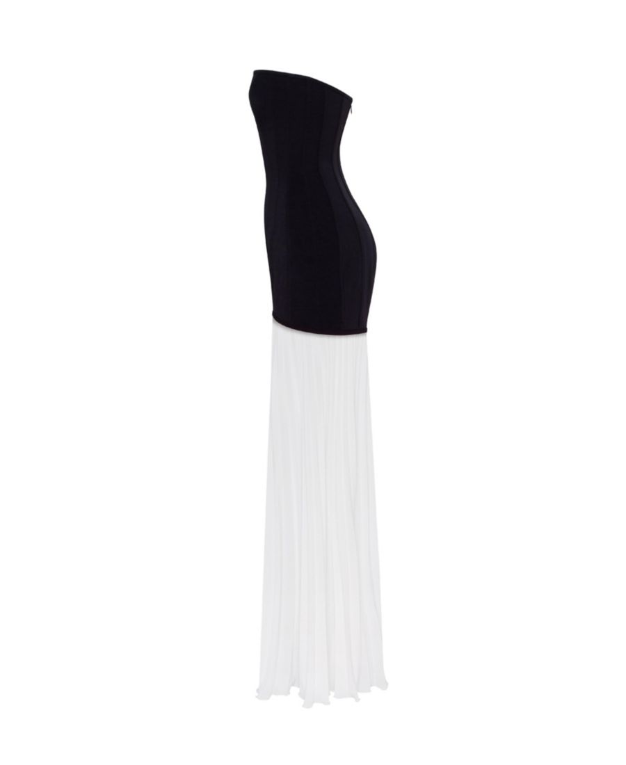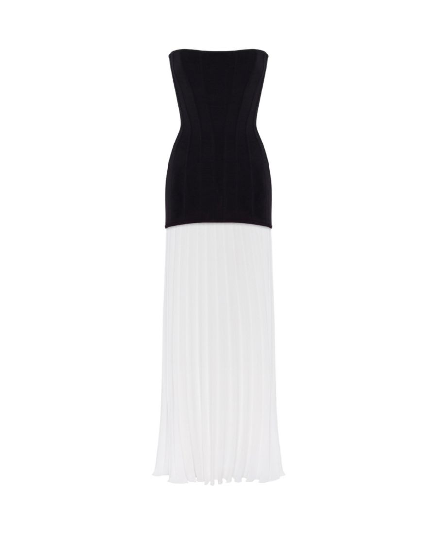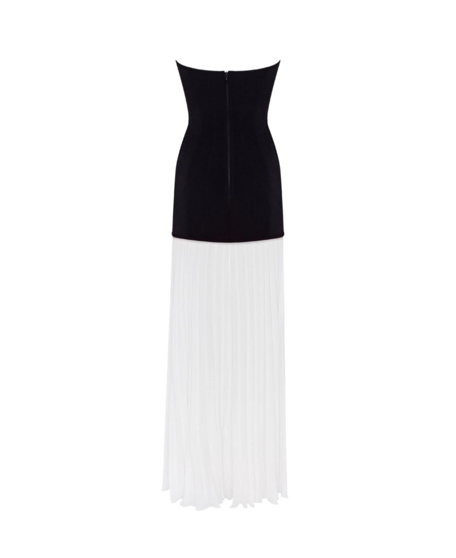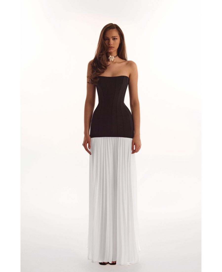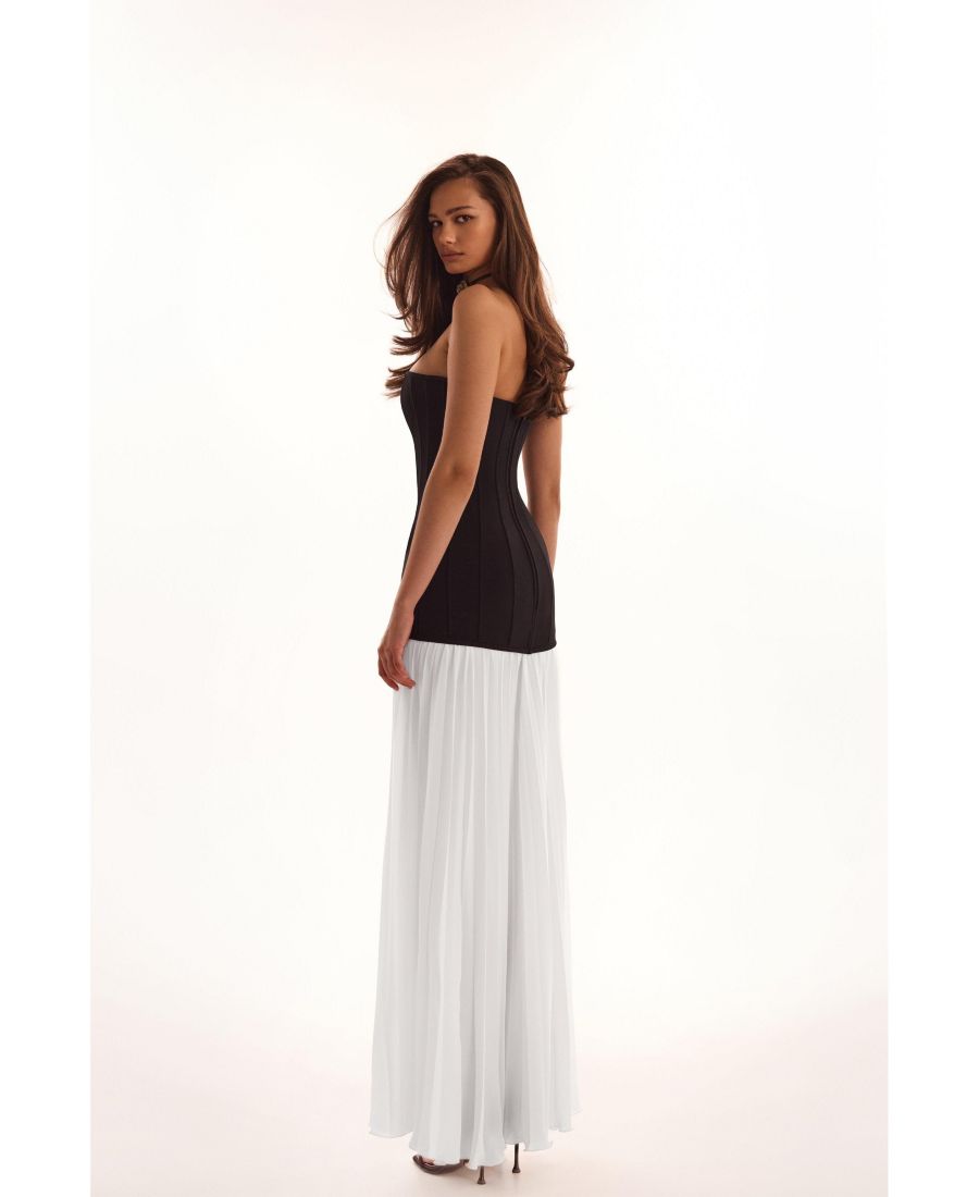 Этот ансамбль создан для моментов, требующих изысканной эффектности. Образ состоит из элегантного черного мини-платья без бретелей, облегающего фигуру и создающего эффектный силуэт, и струящейся белой плиссированной макси-юбки под ним, добавляющей движения и контраста. Воздушная шифоновая юбка смягчает структурированное мини-платье, создавая идеальный баланс между смелой утонченностью и непринужденной грацией. Этот универсальный дизайн позволяет легко преобразить ваш образ, что делает его идеальным для любого элегантного случая.