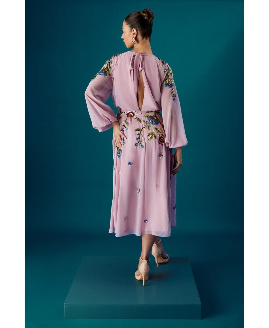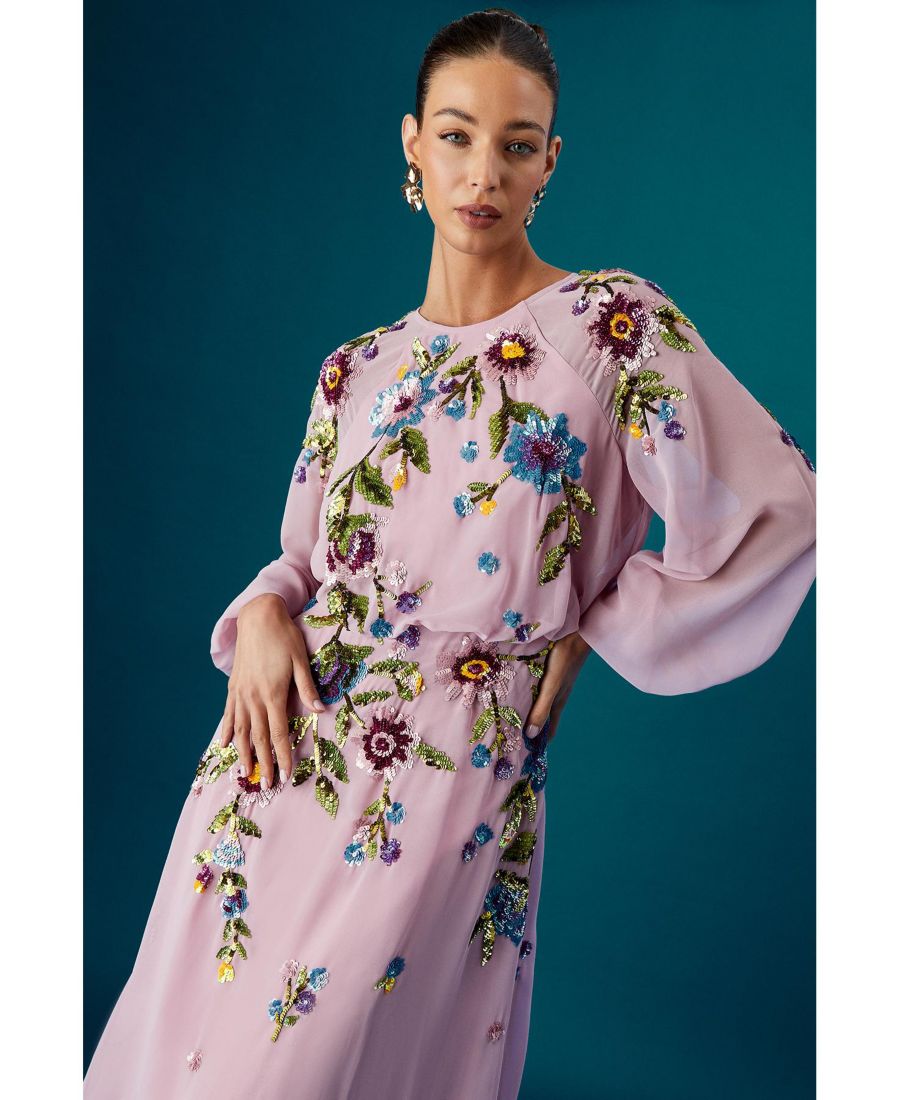 Изысканная вышивка пайетками ручной работы создает потрясающий цветочный узор на платье. Эффектные рукава-фонарики с элегантными присборенными манжетами создают выразительный силуэт. Изысканный круглый вырез горловины дополняет дизайн средней длины. Лестный крой с грациозной струящейся юбкой, которая красиво развевается при каждом шаге. Эффектная открытая спинка с деликатной застежкой добавляет неожиданного очарования. Произведите незабываемое впечатление в этом сногсшибательном платье средней длины от Coast Muse.