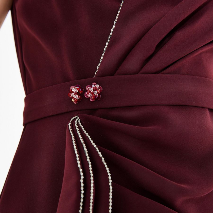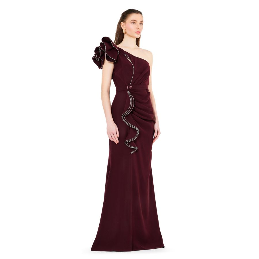 Произведите фурор в этом платье на одно плечо, созданном с учетом скульптурной элегантности и изысканной утонченности. Асимметричный вырез с объемной оборкой и ниспадающей драпировкой на талии, этот силуэт в пол подчеркивает фигуру и визуально удлиняет ноги. Вырез-замочная скважина и разрез добавляют современный, модный штрих. Украшение стразами придает ему королевский вид, идеально подходящий для торжественных вечеров или мероприятий с дресс-кодом черный галстук.