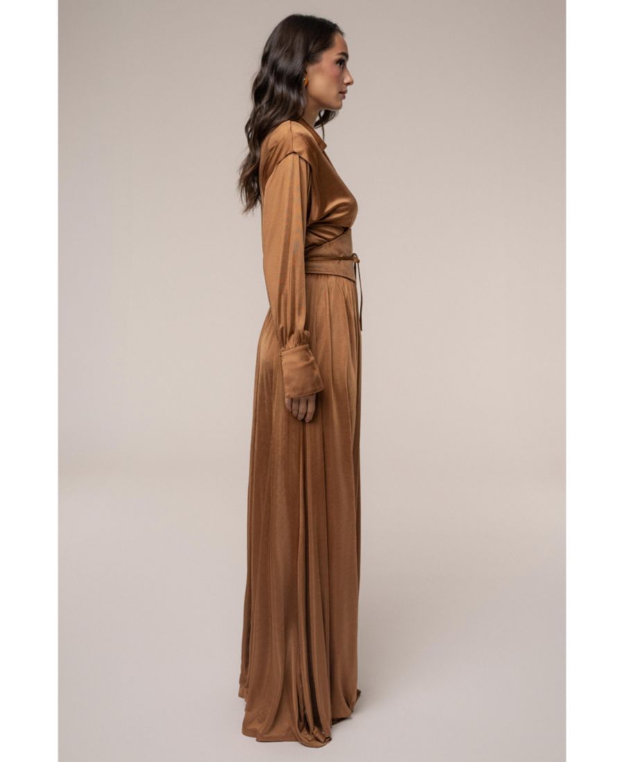 Элегантное женское макси-платье, сшитое из ультрамягкой, струящейся эластичной ткани, обеспечивающее комфорт и подчеркивающее фигуру. Изысканный воротник и глубокий вырез спереди добавляют современный шарм классическому вечернему стилю. Широкий двусторонний пояс из матового атласа и замши на талии подчеркивают и выделяют ваш силуэт. Длинные рукава и изящная длина макси обеспечивают стильную защиту, идеально подходящую для торжественных мероприятий или особых случаев. Создано для универсальности; идеально подходит как для элегантного вечернего платья, так и для эффектного платья для вечеринки. Длина макси: приблизительно 152 см x 56 см от плеча до низа (размер S). 93% вискоза, 7% спандекс (подкладка), 100% полиэстер. Ручная стирка. Импортный товар.