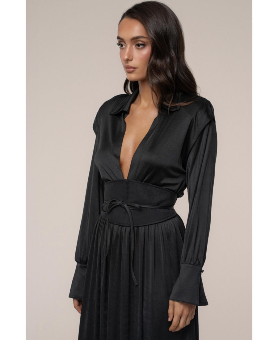 Элегантное женское макси-платье, сшитое из ультрамягкой, струящейся эластичной ткани, обеспечивающее комфорт и подчеркивающее фигуру. Изысканный воротник и глубокий вырез спереди добавляют современный шарм классическому вечернему стилю. Широкий двусторонний пояс из матового атласа и замши на талии подчеркивают и выделяют ваш силуэт. Длинные рукава и изящная длина макси обеспечивают стильную защиту, идеально подходящую для торжественных мероприятий или особых случаев. Создано для универсальности; идеально подходит как для элегантного вечернего платья, так и для эффектного платья для вечеринки. Длина макси: приблизительно 152 см x 56 см от плеча до низа (размер S). 93% вискоза, 7% спандекс (подкладка), 100% полиэстер. Ручная стирка. Импортный товар.