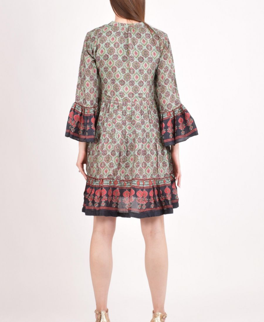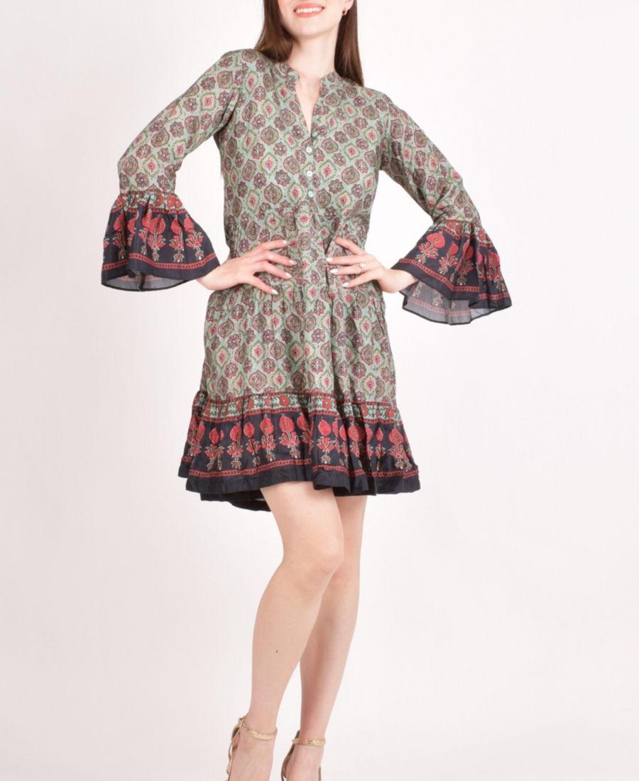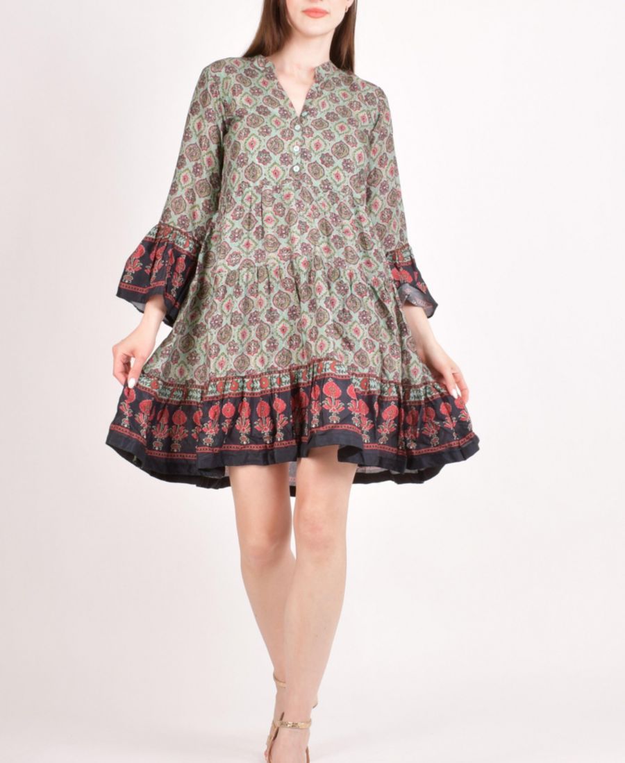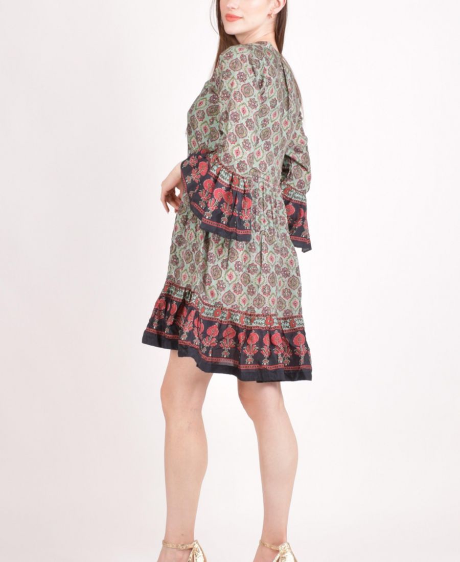 Добавьте в свой гардероб нотку непринужденного очарования с помощью мини-платья в стиле бохо. Это зеленое мини-платье из мягкого муслинового шелка украшено традиционным принтом аджракх, что придает ему вневременную привлекательность. Струящиеся рукава-бабочки и свободный А-образный силуэт обеспечивают комфорт и свободу движений, что делает его идеальным выбором для повседневных прогулок, поездок на выходные или солнечных летних дней.