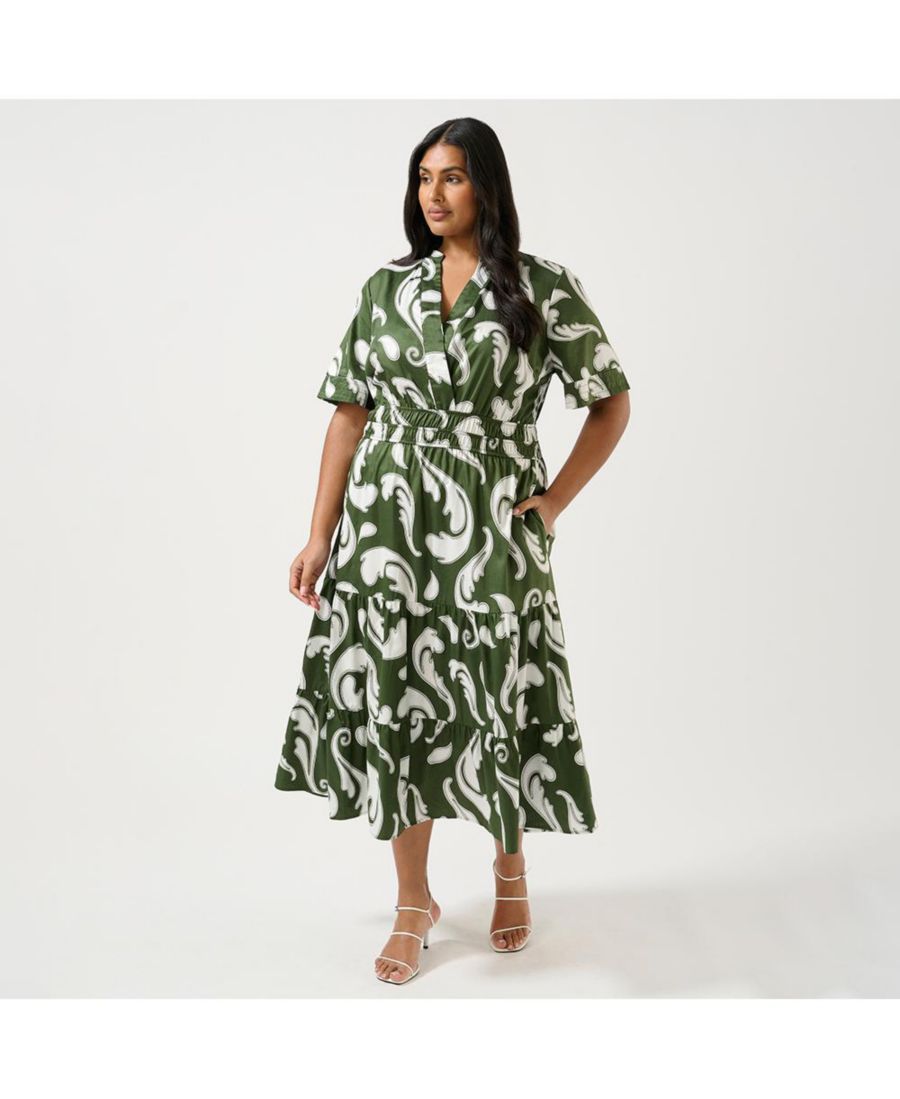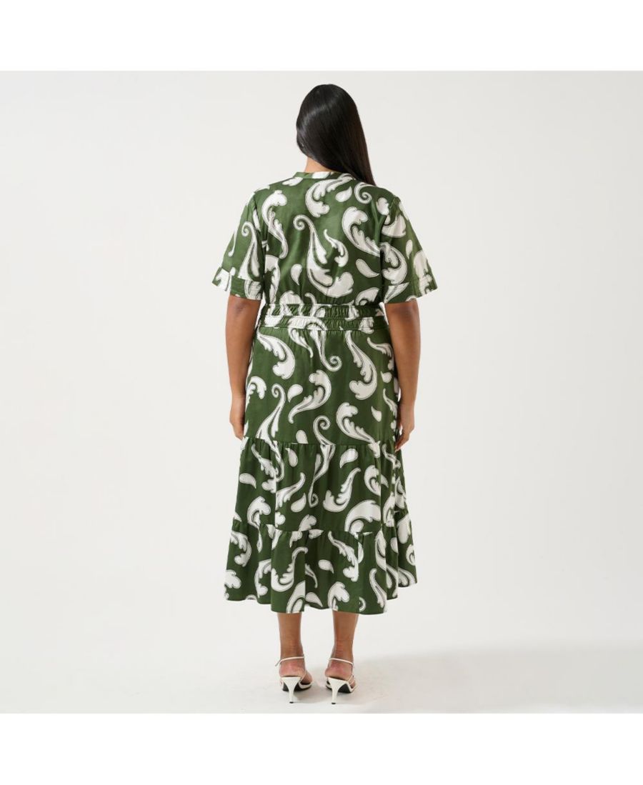 Это миди-платье с причудливым принтом в виде листвы в нежных темно-зеленых оттенках имеет облегающий крой, подчеркивающий ваши изгибы и обеспечивающий свободную посадку. Изготовленное из дышащей хлопковой ткани, платье имеет короткие рукава с манжетами-складками, планку на вырезе и широкий эластичный пояс. Дополните образ туфлями на каблуках и яркими аксессуарами для особого случая или наденьте кроссовки для повседневного шоппинга.