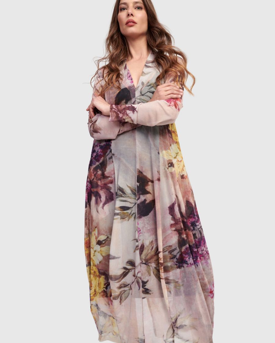 Эта интерпретация нашего фирменного силуэта Кокон выполнена из эластичной прозрачной сетки с роскошным цветочным принтом. Глубокий V-образный вырез, рукава три четверти, боковые карманы, разрез сзади, длина миди. Благодаря особенностям сетчатой ткани, это платье имеет более свободный крой, чем наши модели из трикотажа. Для более облегающего силуэта рекомендуется выбрать размер меньше. В комплекте идет нижняя юбка.