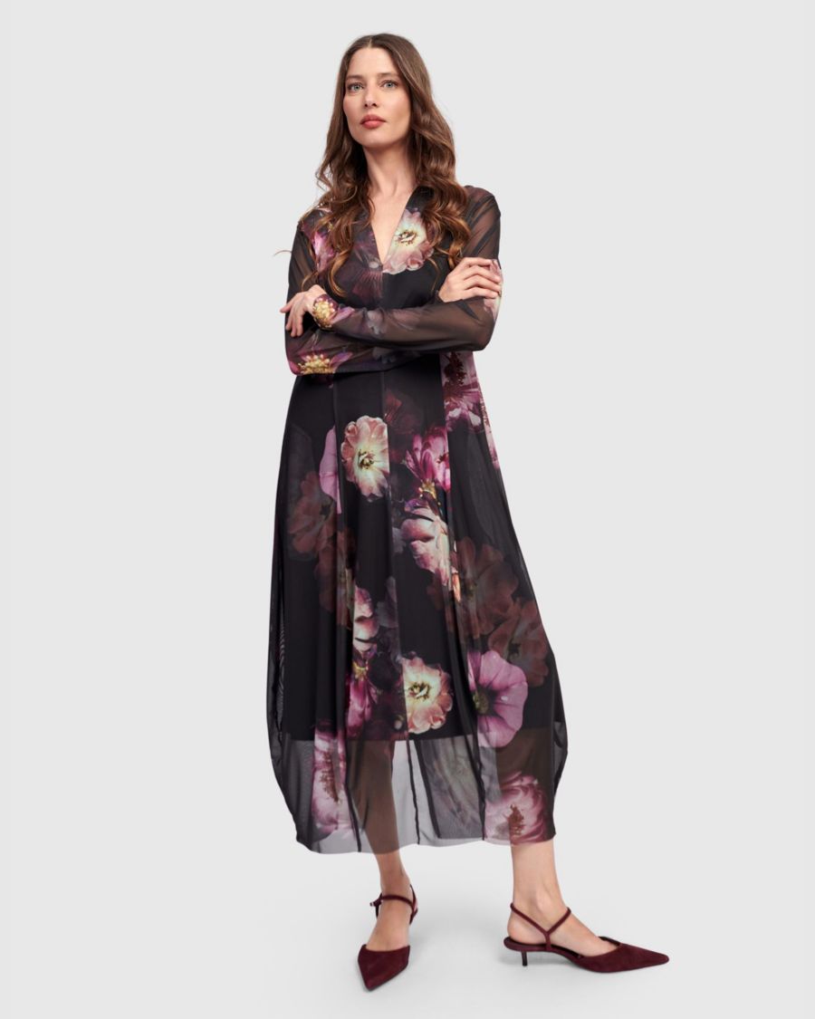 Эта интерпретация нашего фирменного силуэта Кокон выполнена из эластичной прозрачной сетки с роскошным цветочным принтом. Глубокий V-образный вырез, рукава три четверти, боковые карманы, разрез сзади, длина миди. Благодаря особенностям сетчатой ткани, это платье имеет более свободный крой, чем наши модели из трикотажа. Для более облегающего силуэта рекомендуется выбрать размер меньше. В комплекте идет нижняя юбка.