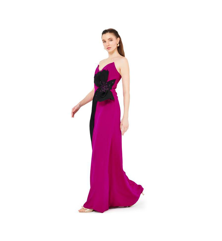 Смелое и изысканное, это платье с контрастными цветовыми блоками создано для того, чтобы привлекать внимание. Скульптурный лиф плавно переходит в юбку А-силуэта, а эффектная аппликация в виде большого банта с украшениями на талии добавляет объема и элегантности. Выразительный вырез и струящийся силуэт делают это платье идеальным выбором для торжественных гала-вечеров или светских мероприятий высокого уровня.