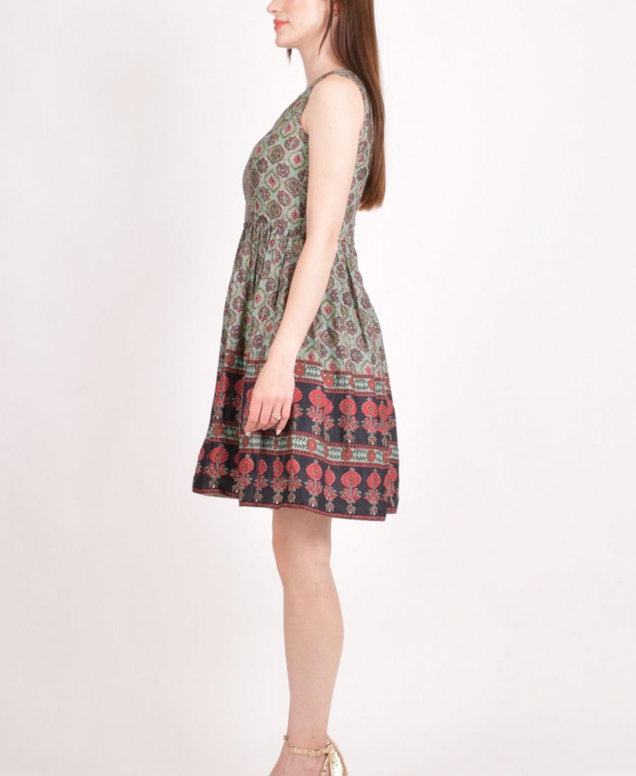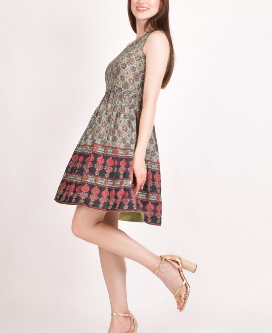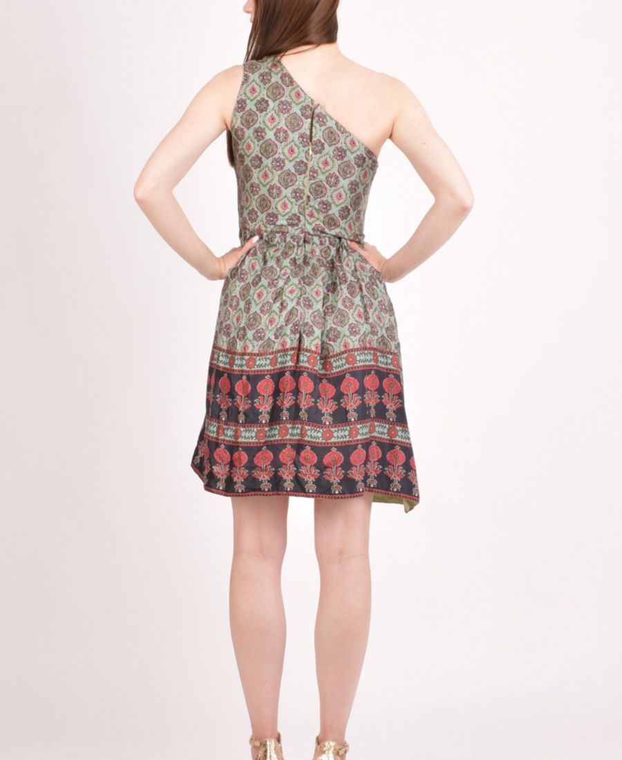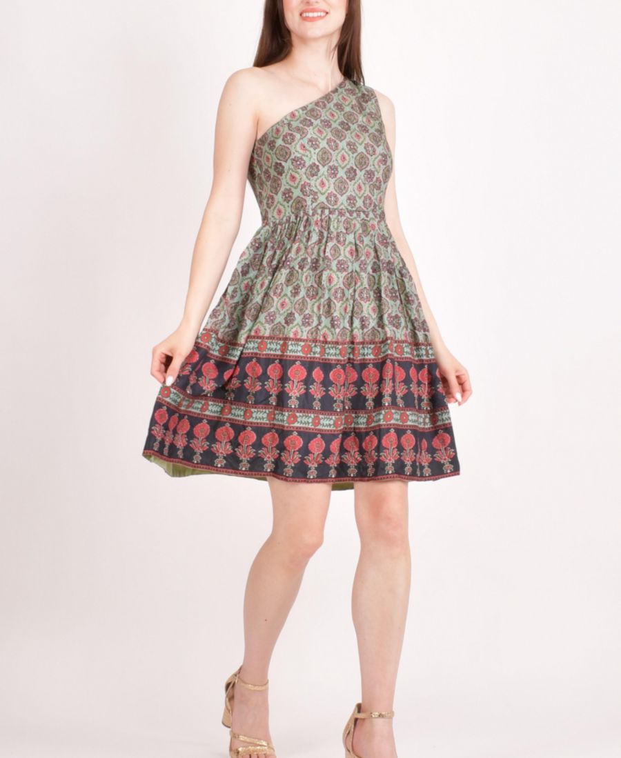 Это мини-платье на одно плечо привнесет в ваш летний образ непринужденный богемный шарм, сшитое из мягкого, легкого муслинового шелка. Насыщенная зеленая основа украшена красивым принтом в стиле аджракх, а широкая контрастная кайма выделяется яркими красными и черными цветочными узорами. Идеальное для летних дней, это платье добавит смелый, но в то же время непринужденный штрих к вашему летнему гардеробу.