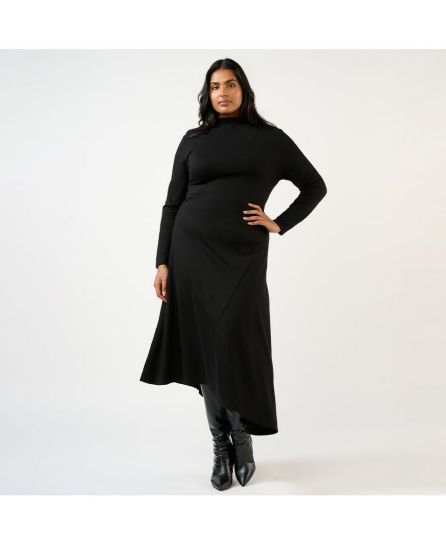 Платье Abagail сшито из мягкой черной вискозной ткани, сочетающей в себе элегантность и комфорт. Платье средней длины с высоким воротником-стойкой и длинными рукавами подчеркнет строгий, приталенный силуэт, а асимметричный подол добавит современный штрих к классическому дизайну. Сочетайте его с элегантными ботильонами и строгим блейзером для образа, который легко подойдет как для работы, так и для ужина.
