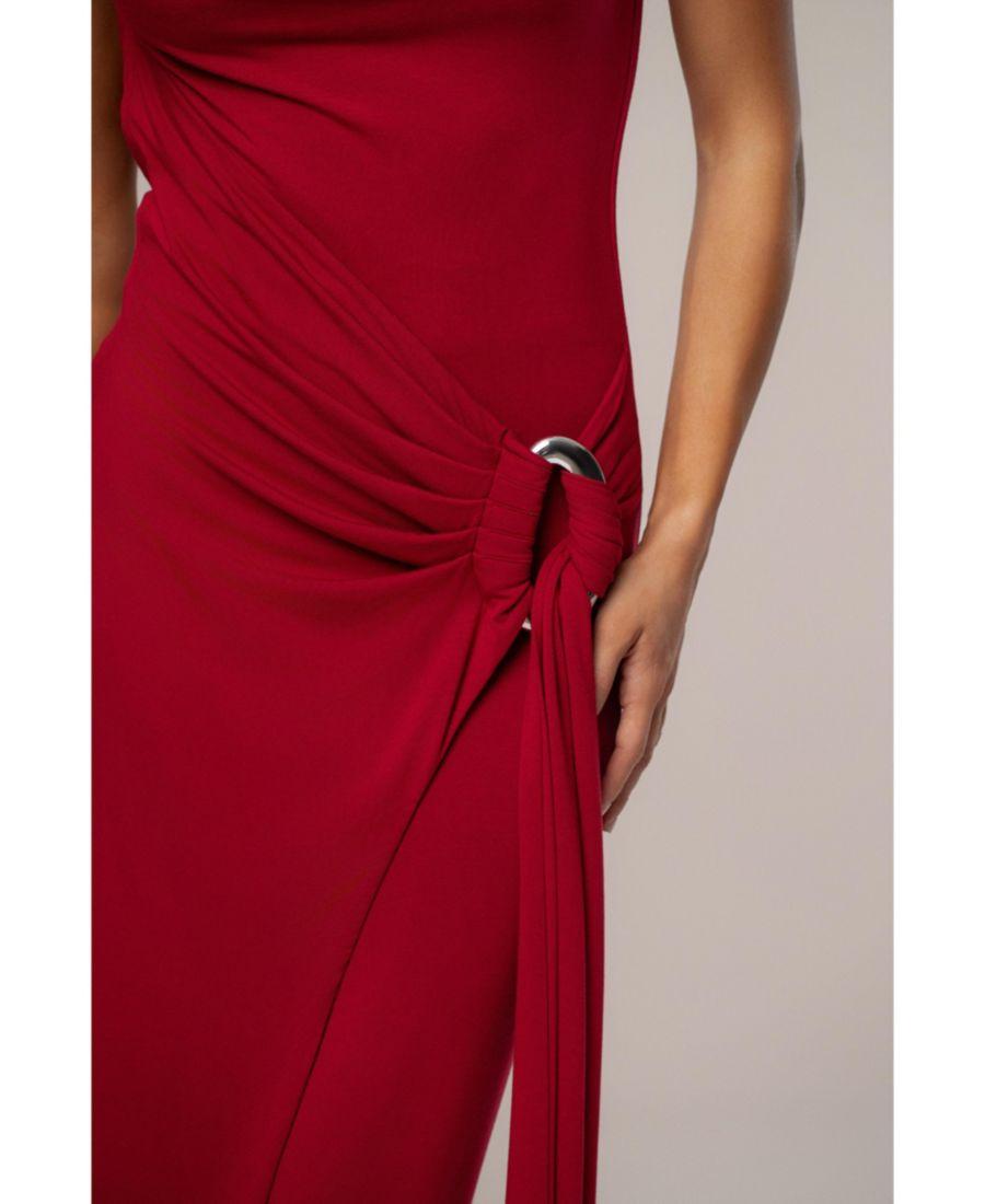 Приблизительная длина: 137 см x 56 см; Вырез горловины "хомут" Надевается без застежки, серебристая пряжка с драпировкой На подкладке, эластичная ткань Без рукавов, боковая драпировка на талии 92% вискоза, 8% спандекс Ручная стирка Импортный товар