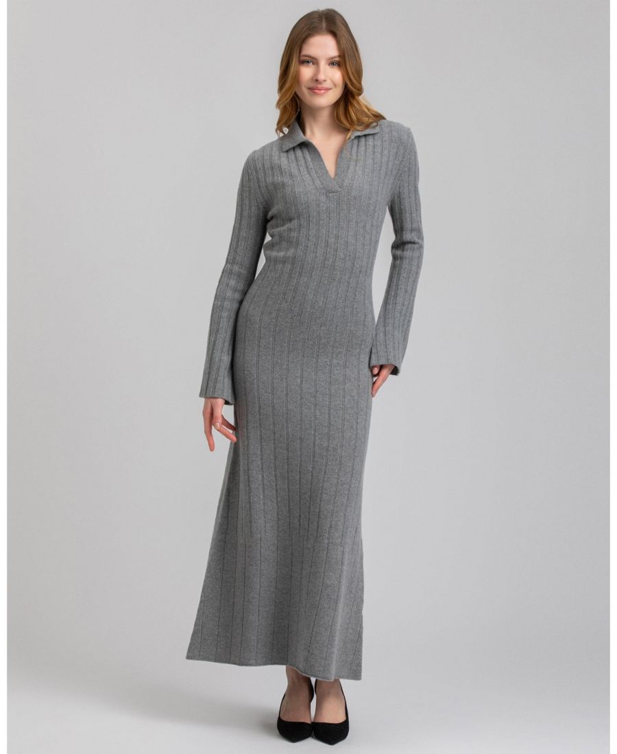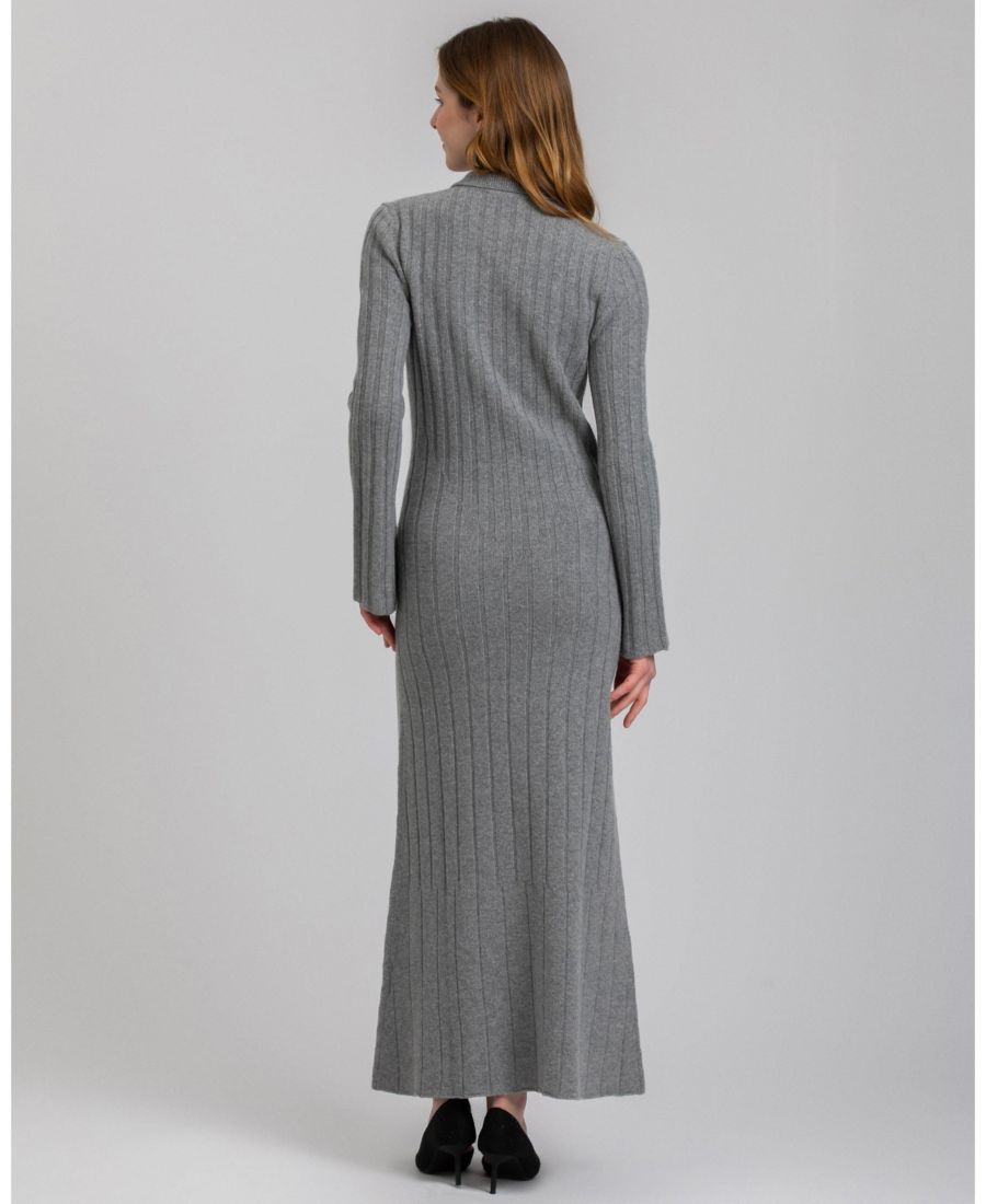 Это расклешенное платье с длинными рукавами, облегающее фигуру, сшито из мягкой смеси мериносовой шерсти и кашемира. Ребристая текстура имеет различную ширину и симметрию, создавая уникальный узор, который добавляет визуальной привлекательности. Благодаря эластичной ткани, длине макси и классическому воротнику-стойке с V-образным вырезом, это платье одновременно удобное и выгодно подчеркивает фигуру.