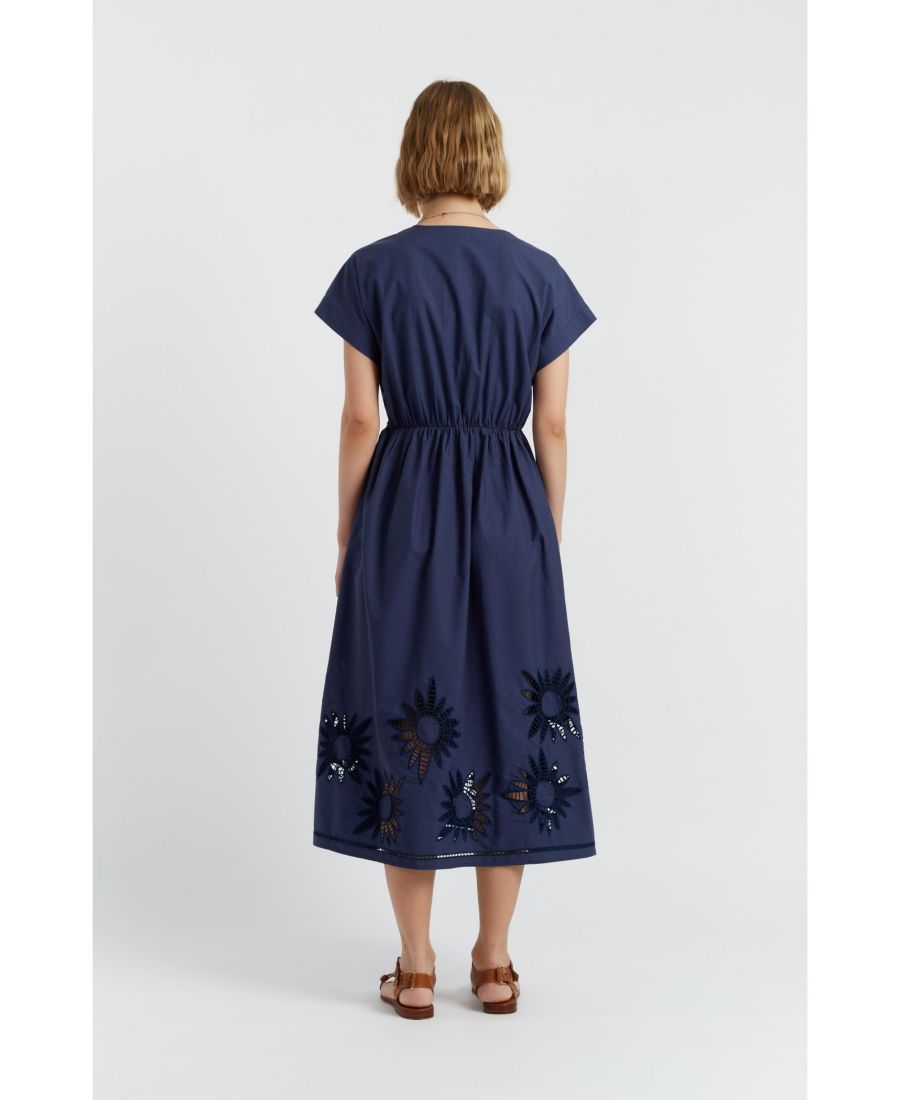 Это платье с вышивкой, сшитое из 100% чистого хлопка классического темно-синего цвета, сочетает в себе вневременную элегантность и комфорт. Благодаря V-образному вырезу и эластичной талии, оно создает изящный силуэт, подчеркивающий естественную фигуру и обеспечивающий свободу движений. Тонкая вышивка добавляет текстуру, поднимая платье на новый, утонченный уровень. Очарование и непринужденный стиль.