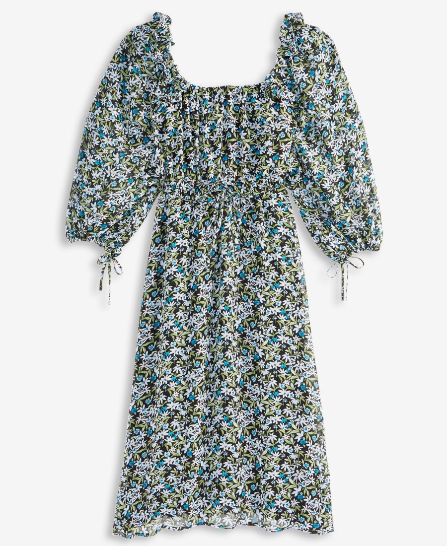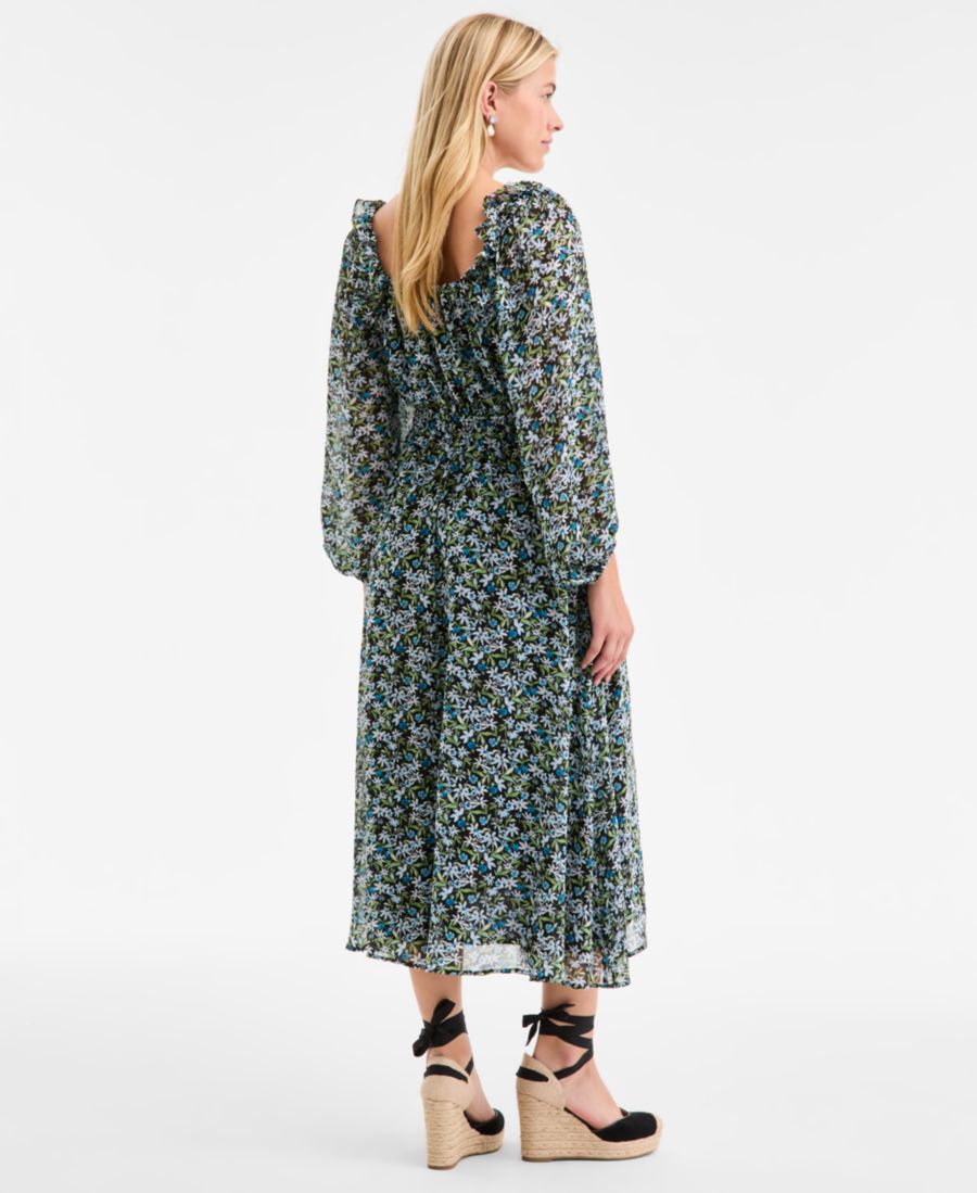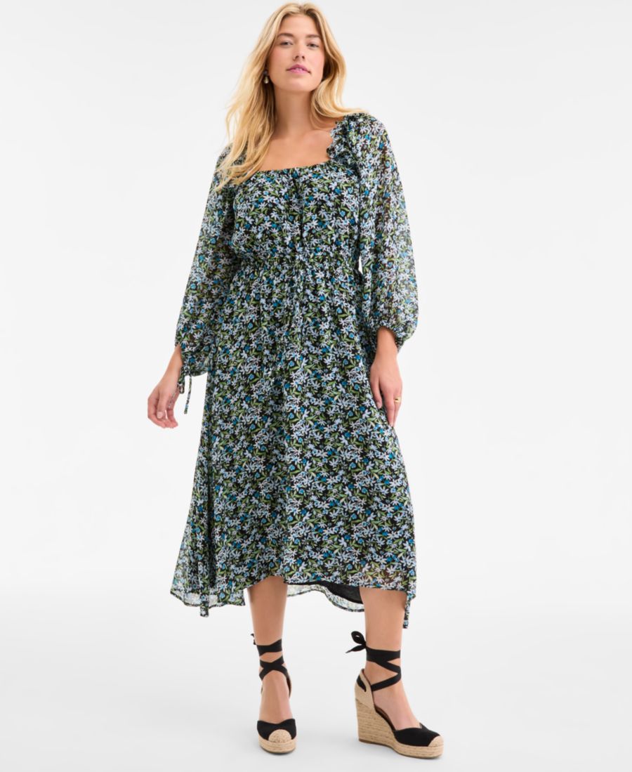 Примерно 46,5 дюймов в длину от центра задней части шеи до низа Квадратный вырез Длина ниже колена до середины икры Шифон: гладкая, прозрачная тканая ткань Надевается без застежек Оборки на плечах; эластичная талия Рукава-блузон; завязки на манжетах На подкладке, эксклюзив Macy's Внешний и внутренний слой: 100% полиэстер Машинная стирка Импортный товар