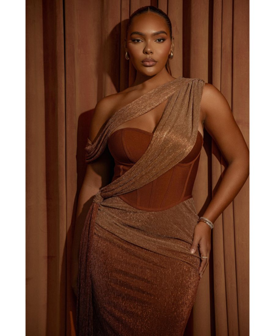 Платье-макси Celestina с драпировкой покорит ваше сердце своим восхитительным драпированным вырезом, корсетным дизайном и изящной драпировкой на талии. Созданное из потрясающего сочетания бандажной и легкой мерцающей ткани, это платье-макси дополнено регулируемыми бретелями, вставками в чашечках и косточками по бокам для придания формы. Застежка-молния сзади. Эластичная ткань.